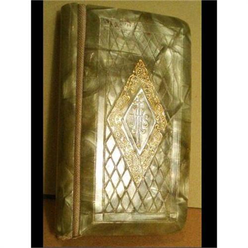This is a numbered dated ( 1924) fancy celluloid cover bible ( prayer book?) in French that is in really great shape. IT still has its silk bookmark ( that is the frayed piece you see in the photos and not the binding being damaged). Rich 18kt gilding is on the edges of the pages and they are in excellent condition. This measures 4 1/2" x 2 1/4". It has been well loved and taken care of.