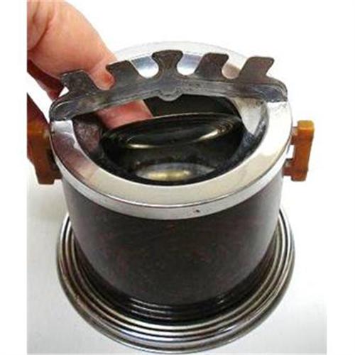 THIS ONE OF THE KIND ART DECO TABLE ASHTRAY, MADE BY RUSSAKOV, CHICAGO/NEW YORK, "JUNIOR SMOKE MASTER", MADE FROM CHROME AND I JUST LOVE THE BUTTERSCOTCH COLOR BAKELITE HANDLES,TOP LID IS REMOVABLE BUT IT HAS A TINY SWING LID IN THE CENTER WHICH FLIPS OPEN ON THE LIGHTEST TOUCH, - LOVE THE STYLE AND CHOICE OF COLORS AND MATERIALS,EXCELLENT CONDITION FOR IT'S AGE, please see images, AND MEASURES ABOUT 5" HIGH X 3 3/4" IN DIAM., US BUYER TO PAY 8.00 FOR SHIPPING PLUS INSURANCE.THANKS.