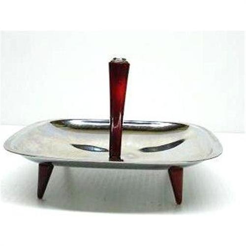 THIS IS LOVELY ART DECO STYLE CHROME SQUARE SERVING DISH WITH CHERRY COLOR BAKELITE POST AND LEGS, MADE BY WELL KNOWN "GLO-HILL" FOR GOURMATES OF CANADA,Measures about 7" X 7" and 5" high - EXCELLENT USED CONDITION - US Buyer to pay 8.00 for shipping plus insurance.THANKS.
