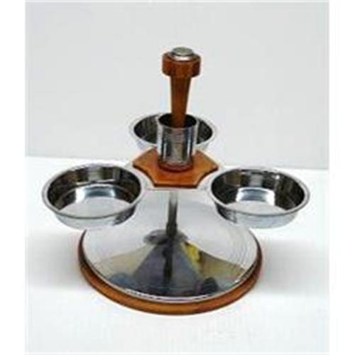 THIS IS LOVELY ART DECO STYLE TABLE STAND,TO SERVE CONDIMENTS OR NUTS ETC. MADE FROM CHROME AND BUTTERSCOTCH COLOR BAKELITE,MADE BY WELL KNOWN "GLO-HILL" FOR GOURMATES OF CANADA, the pedestal is heavy to sustain 3 small dishes attached at post and this part is made to turn or revolve as what we used to call "lazy Susan", It stands about 9 1/2" high - EXCELLENT CONDITION - US Buyer to pay 9.00 for shipping plus insurance.THANKS.