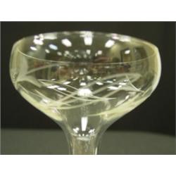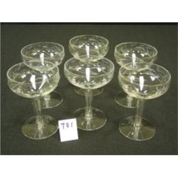 Set of 6 deco champagne stems. Etched with deco leaf & flower. Hollow stems. 4.75" tall. Condition: Excellent