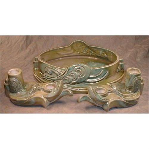 Here is a great looking deco style art pottery console set, featuring a round, rimmed plateau centerpiece bowl and two candle holders.