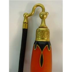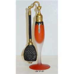 Deco De Vilbiss Atomizer (Marked), black & gold design on frosted glass body with orange perfume well & round base with gold band. Black net covered bulb & tube, all original. Good condition except for a discoloration on base (might be removable)