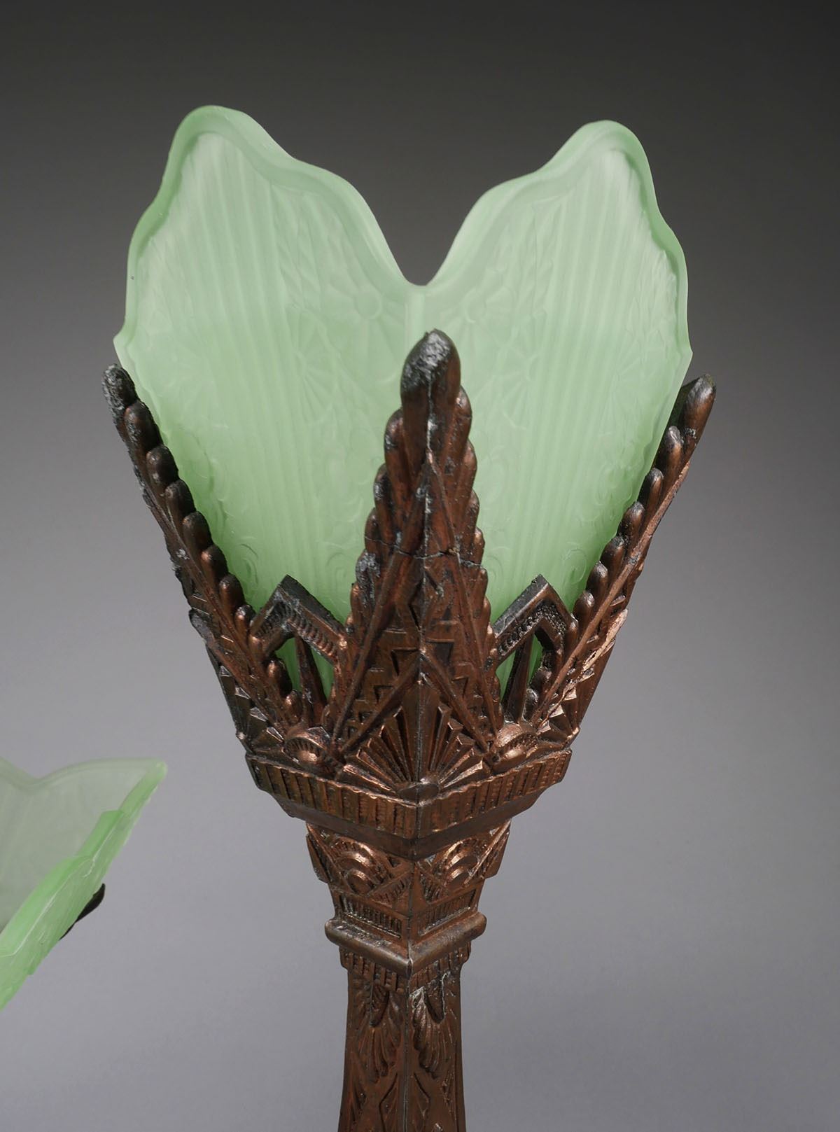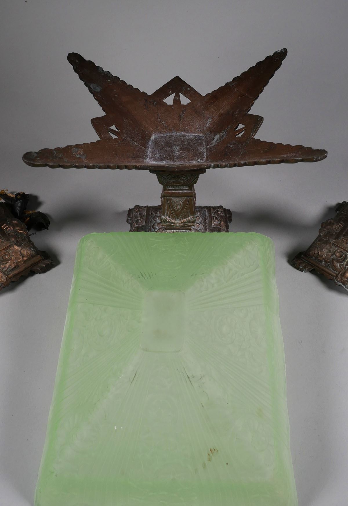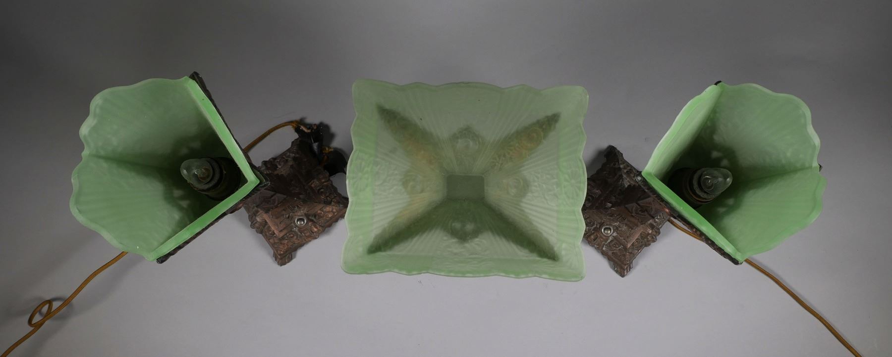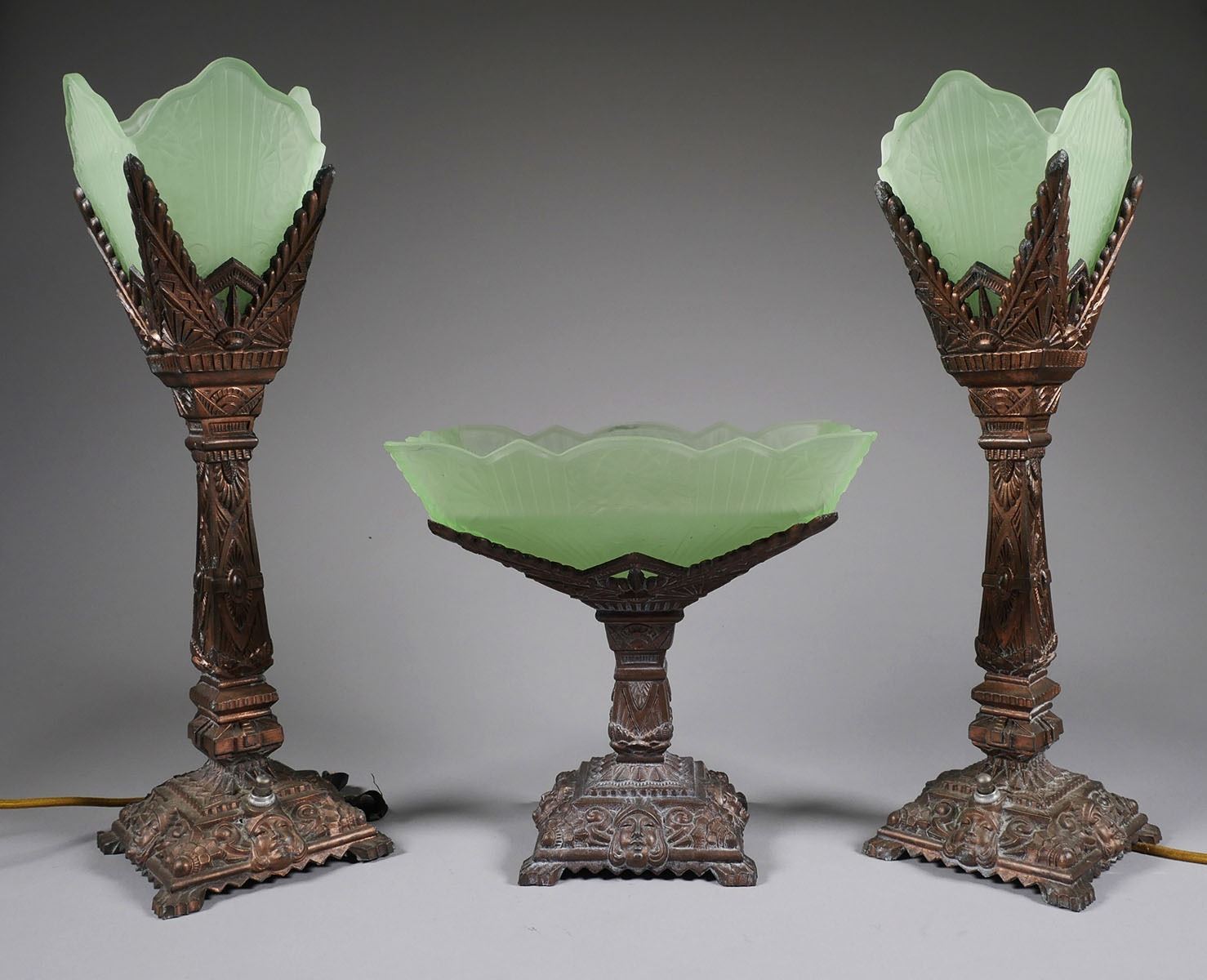 Vintage Art Deco 3 piece mantle set. Two lamps & centerpiece with frosted uranium glass. Lamps measure 16 1/4" tall, centerpiece measures 9" x 9" x 7 1/2". One support arm on centerpiece has been repaired. Shades & centerpiece have chips around the rims. Lamps require re-wiring. See photos for more details on condition. |