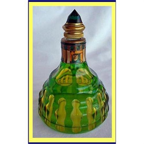 Outstanding quality: glass bottle reminiscent of figural stylised woman in a wide skirt. Glass is emerald green cut to yellow. Original full dauber at the