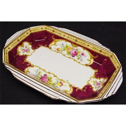 LOVELY TRAY OR DISH MADE BY ROYAL ALBERT CROWN CHINA OF ENGLAND IN LADY HAMILTON PATTERN, LOVE THE ART DECO STYLE, DEEP BURGUNDY COLOR AND BEAUTIFUL FLORAL SECTIONS. EXCELLENT USED CONDITION, NO CHIPS OR CRACKS.MEASURES ABOUT 7" X 4 3/4" US BUYER TO PAY 7.50 FOR SHIPPING PLUS INSURANCE.THANKS. Please ignore the "lines" these come from camera and lights - glare.