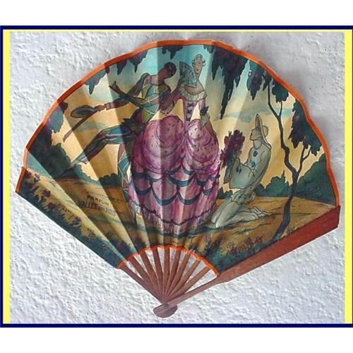 Art Deco commercial advertising perfumed fan L.T. Piver depicting masquerade by Guy Arnouy for Vallee des Rois (Valley of the Kings). Made in France ca 1924.