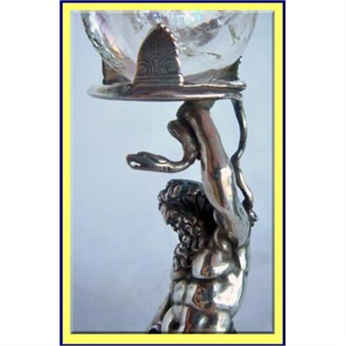 Superbly detailed figure of Atlas holding up the earth. Stands on a round base with unusual, engraved pattern around the side. Atlas, with huge wavy beard, blind eyes and floral wreath on his head, heroically holding a globe made of pure rock crystal, encircled with a writhing snake, about to pounce. The detail is outstanding - from the finely modelled fingers, to the nails on the toes, the locks of hair and wonderful muscled body.<P><P>