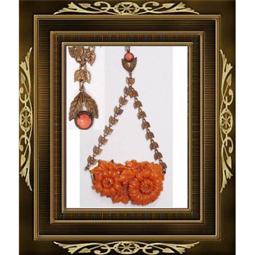 Take a look at the rich leaf chain that hold this coral flower pendant. Very feminine and most unusual this long necklace is really prettier than the photos. The necklace is 17? long and then you can add to that the drop which is 6?. The pendant is 2? wide and marked Japan on the back. The pendant comes to a point at the top and as you can see there is a tiny coral cab on the part that looks like a slide.
