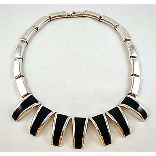 A stunning and vintage art deco signed "Taxco Mexico" heavy sterling silver and black onyx 15" long by 1 1/8" across at widest point ladies necklace or choker in excellent condition. Weighs in at a whopping 48.2 grams.Would be a fab addition to any collection!