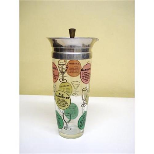 UNIQUE COCKTAIL SHAKER DECORATED WITH 9 FANCY AND MOST POPULAR RECEIPIES, SHOWING PROPER GLASS FOR EACH DRINK TO SERVE FROM, WHICH IS ALWAYS HELPFUL, as per images - THIS SHAKER IS FITTED WITH WHAT IT LOOKS LIKE HIGHLY POLISHED CHROME, OR IS IT SILVERPLATED?, NOT MARKED, IT ALSO HAS A STRAINER FITTED ON INSIDE TOP, STANDING about 9 1/5 high, and 4 1/2 diam on top opening.Excellent used condition, no chips or cracks,US Buyer please remit 8.00 for shipping plus insurance.THANKS.