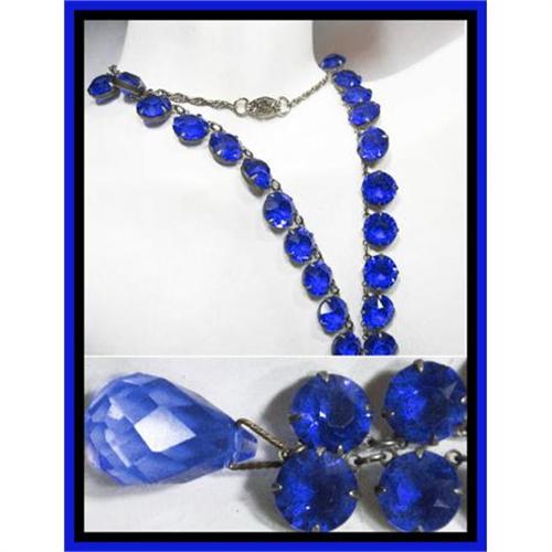 These open back necklaces are not easy to find much less in such a rich blue color. This one has a large cut glass drop in the center which just sets off these stones to no end!. The length of the necklace is 17? with an additional 1? drop. The chain is sterling, the settings are silver over brass. The stones are beautiful in this fabulous piece and really would make anything you wear it with look like a million bucks!