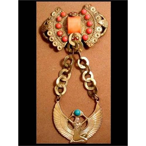 Right from the 1920?s comes this fancy highly collectible drop brooch ( I have the necklace and bracelet on Go Antques as well). This brooch has rich layered filigree work with coral accents and enamel on the points. The hand wrought chain holds a winged Isis with a turquoise stone in her hands. This whole brooch measures a whooping 4 ½" long and 2" wide. It is heavy and well made and looks like it came right out of a Cleopatra movie. This is a piece for high end collectors and one that will get you a LOT of compliments, In all my years of selling and buying I have never seen another like it.
