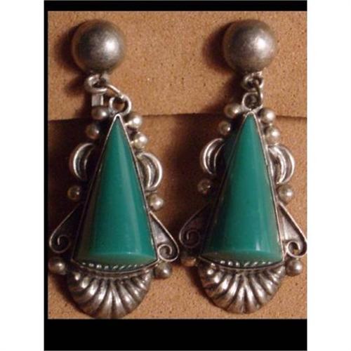 These 1 1/2" long sterling and green onyx earrings are really pretty with the raised deco designs. These are screw on and they are signed on the back. From what I can make out on the back it has J.G 950 hecho en mexico. THere is also something in the center but I can't make it out. These are in great shape and really well made.