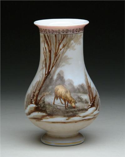 DECORATED ART GLASS VASE. White opal glass with a decoration of a sheep grazing on a pasture. Vase has pink decorated border with black scrolls at upper rim. SIZE: 8 in. t. CONDITION: Very good to excellent. Collection of Johanna and Sean Billings 5-60991