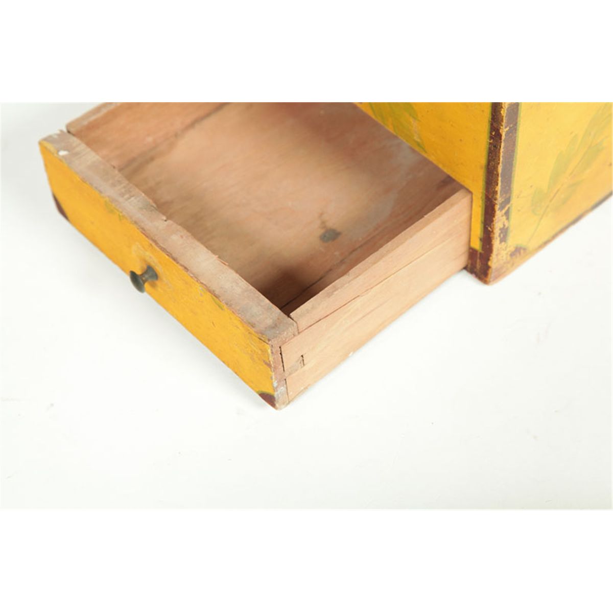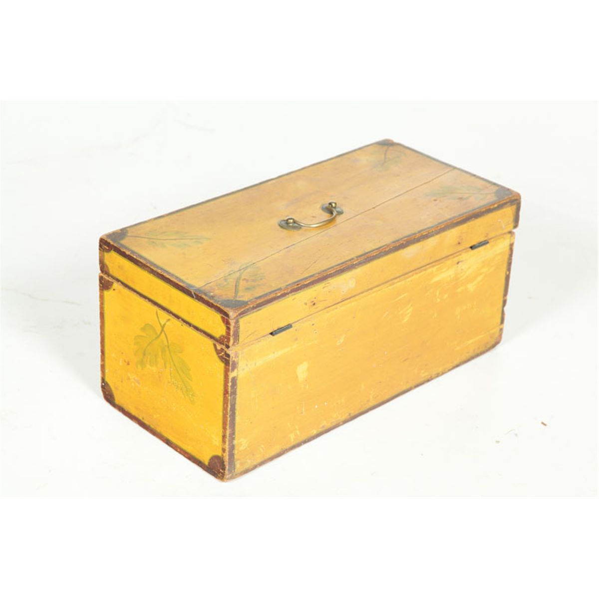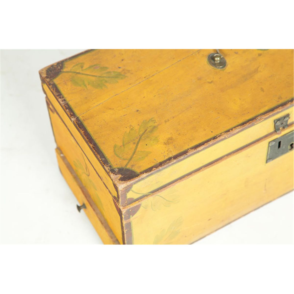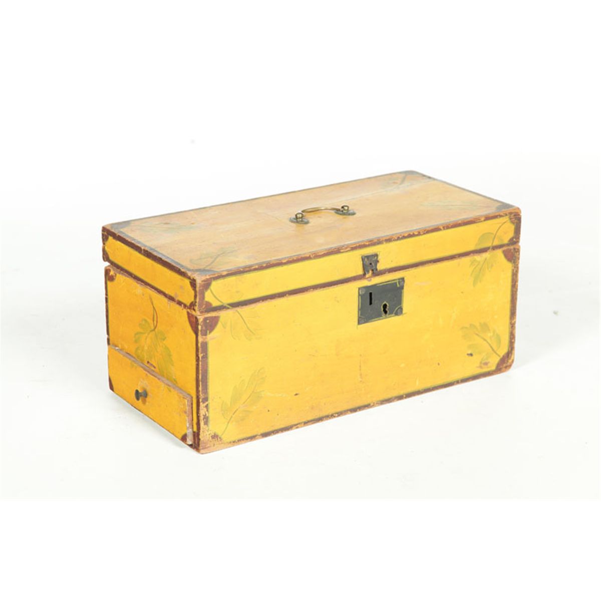 American, 1830-1850, pine. Lift lid and an unusual, full-width drawer on the left side. Retains its original yellow paint with green leaves and brown trim. Period brass on the lid. Minor imperfections. 8"h. 17 1/2"w. 8 1/2"d. Ex Gail Piatt (New Hampshire).