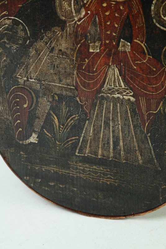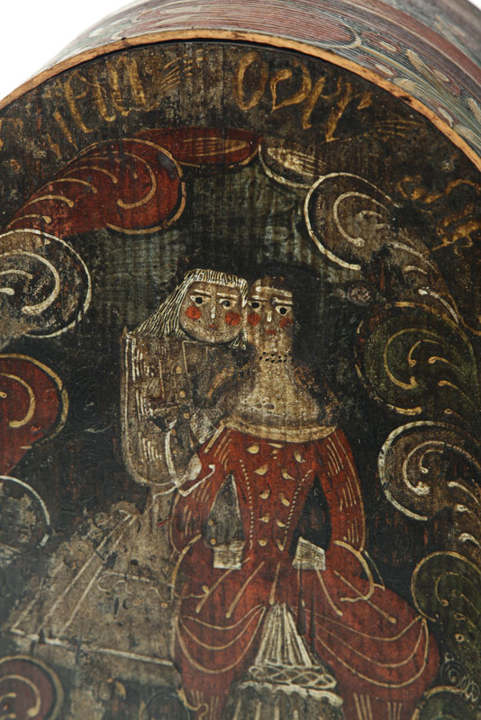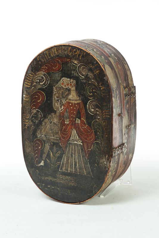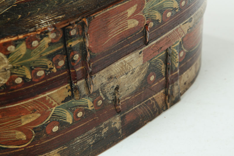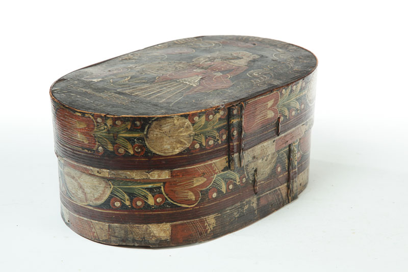 American or European, 19th century. Oval bentwood with laced seams and good original decoration of tulips and man and woman in colonial dress. Minor edge loss. 8"h. 18"w.