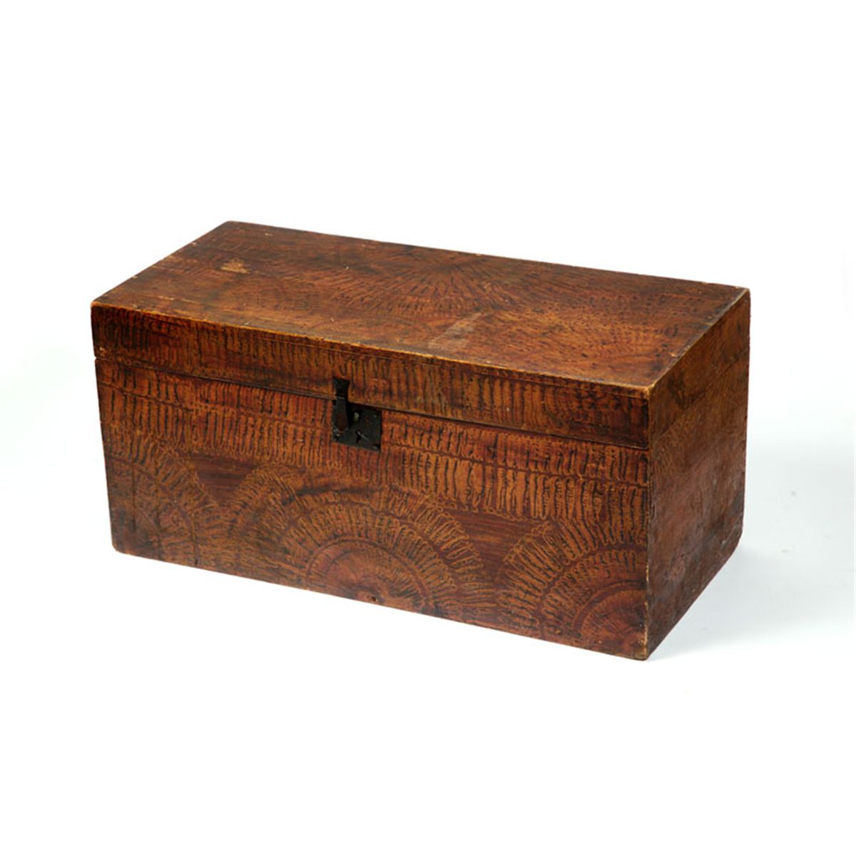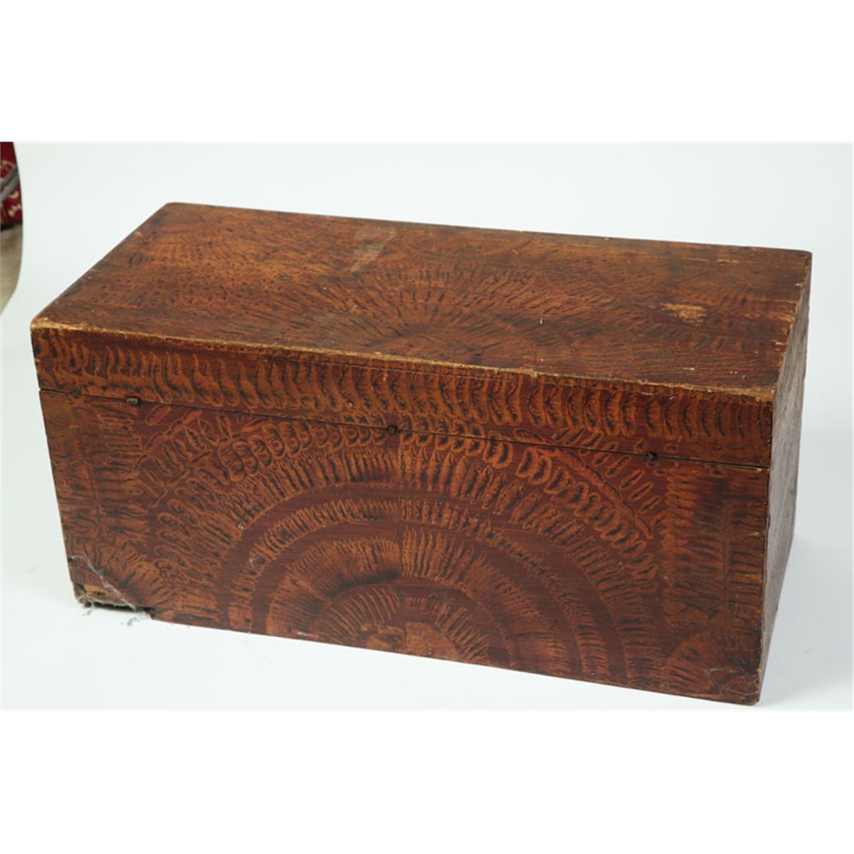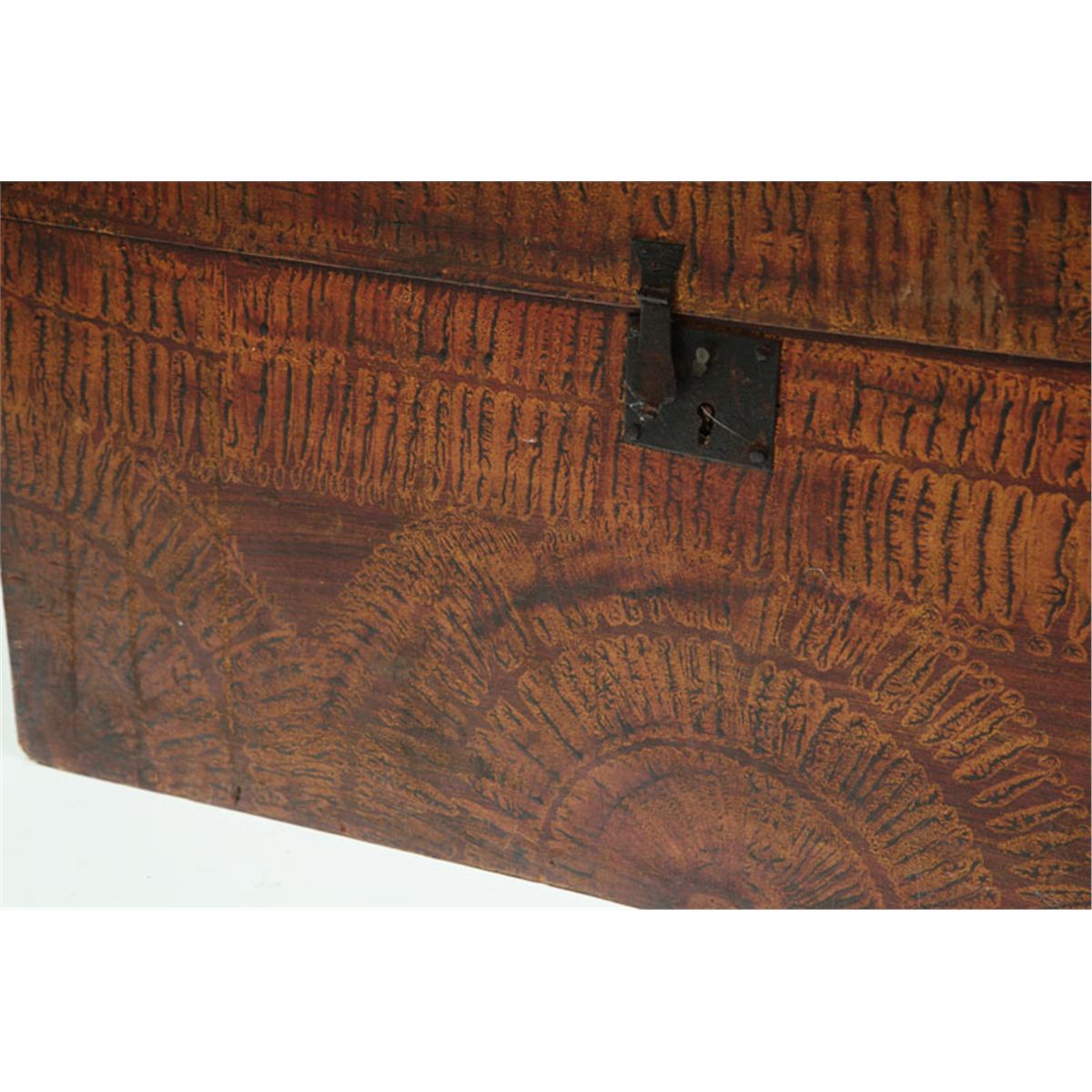 New England, 1820-1840, pine. Dovetailed box retaining its original vinegar paint decoration on front, top, sides, and back. 14"h. 30"w. 14"d. Ex Sam Forsythe (Ohio).