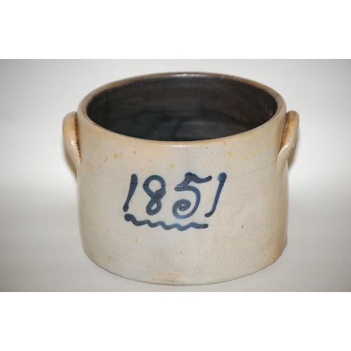 DECORATED & DATED STONEWARE CROCK - 6 1/2" UNMARKED DOUBLE HANDLED STONEWARE STORAGE CROCK W/ LARGE 1851 DATE DECORATION ON FRONT & SQUIGGLY LINE DECORATION ON BACK (PROBABLY NY STATE)(6 1/4" T X 8 1/2" DIA.) - IMPERFECTIONS