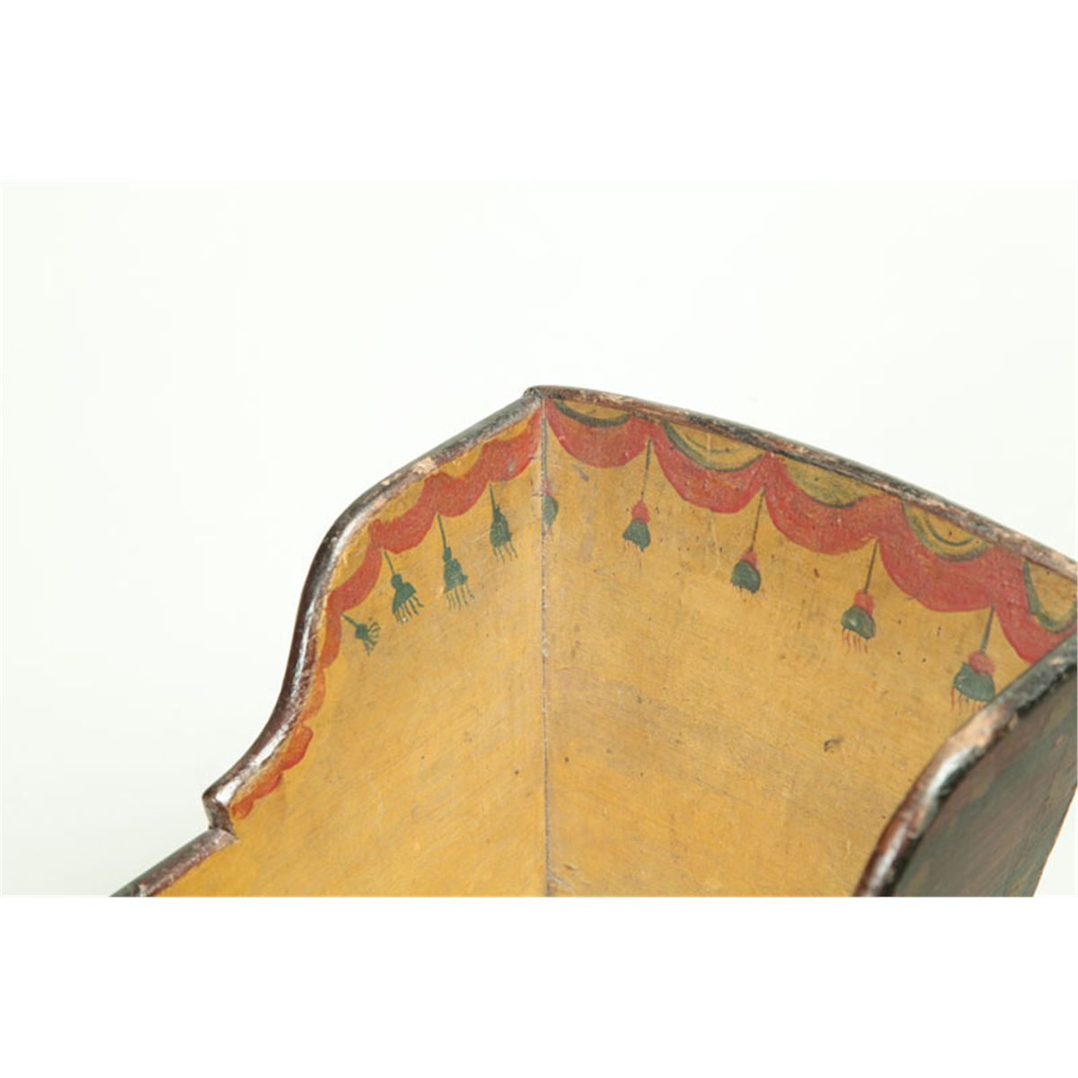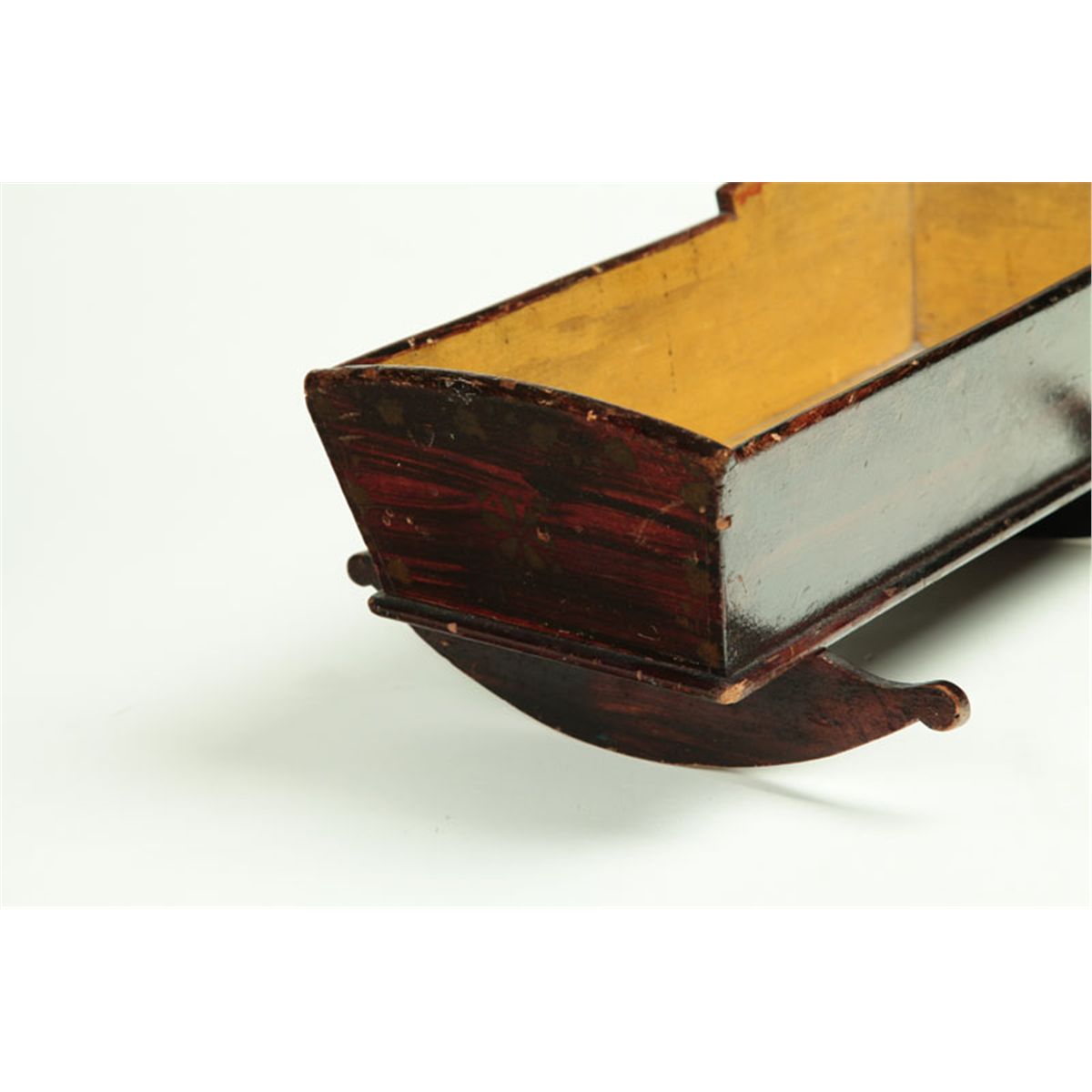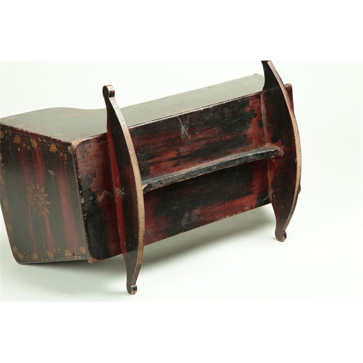 Probably New England, 1820-1850, softwood. Nailed construction and retains its original paint consisting of swags and tassels on a yellow ground inside, and gold stenciling on a faux rosewood ground on the outside. 8 3/4"h. 15 1/2"l. Sold at Cowan's Auctions (Cincinnati), May 2004, lot 1191.