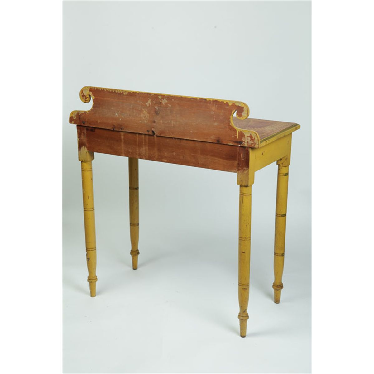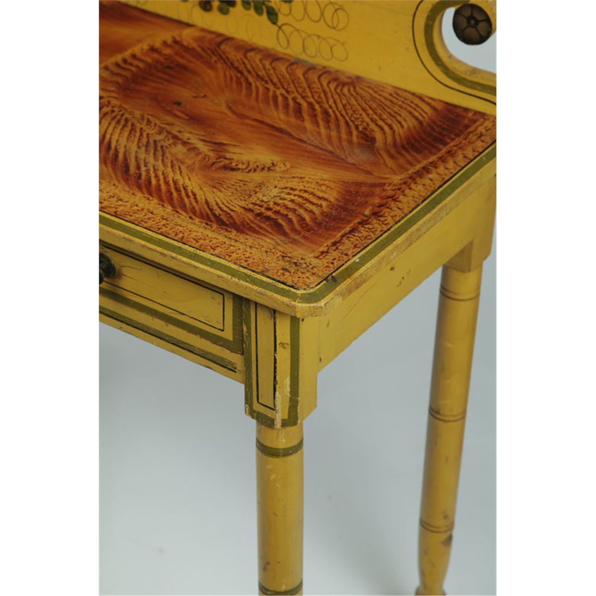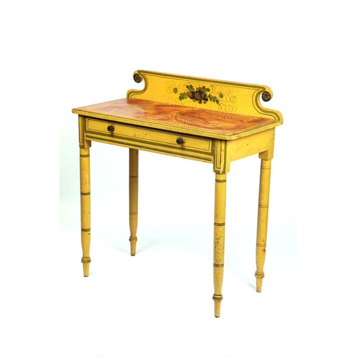 New England, 1820-1850, pine. Scroll-cut backsplash, one drawer, and turned legs. Retaining its original fruit decoration against a yellow ground, and a fancy decorated top surface. Age split to the top, period brass pulls. 34 1/4"h. 32"w. 15 1/2"d. Ex Tom Delach (Ohio).
