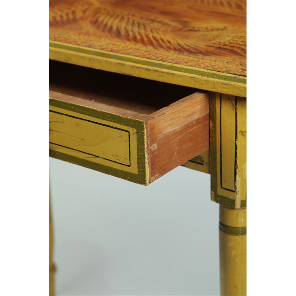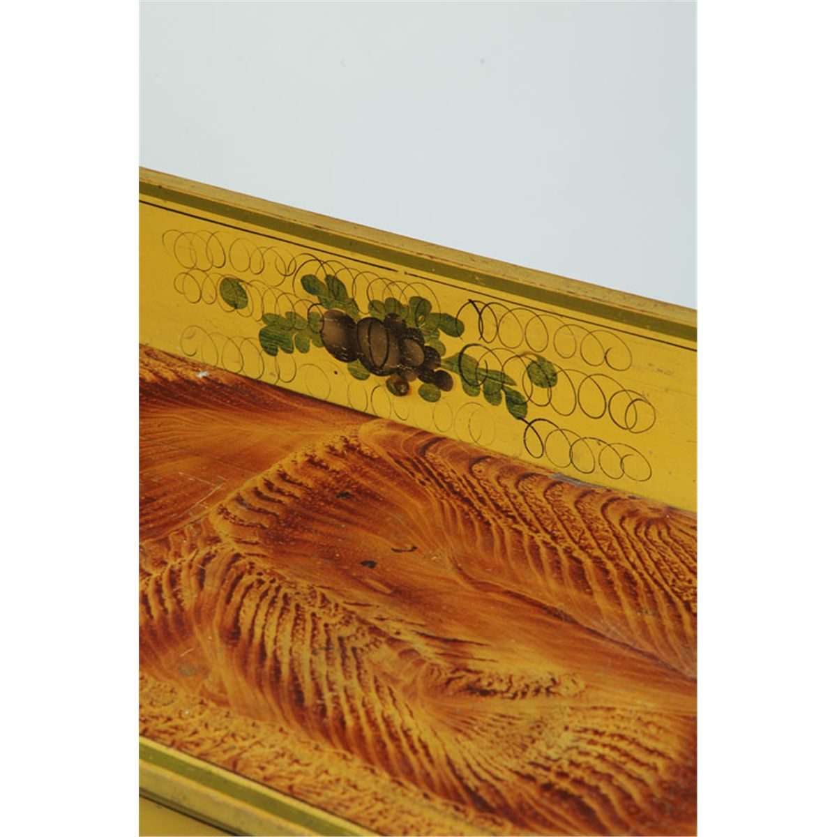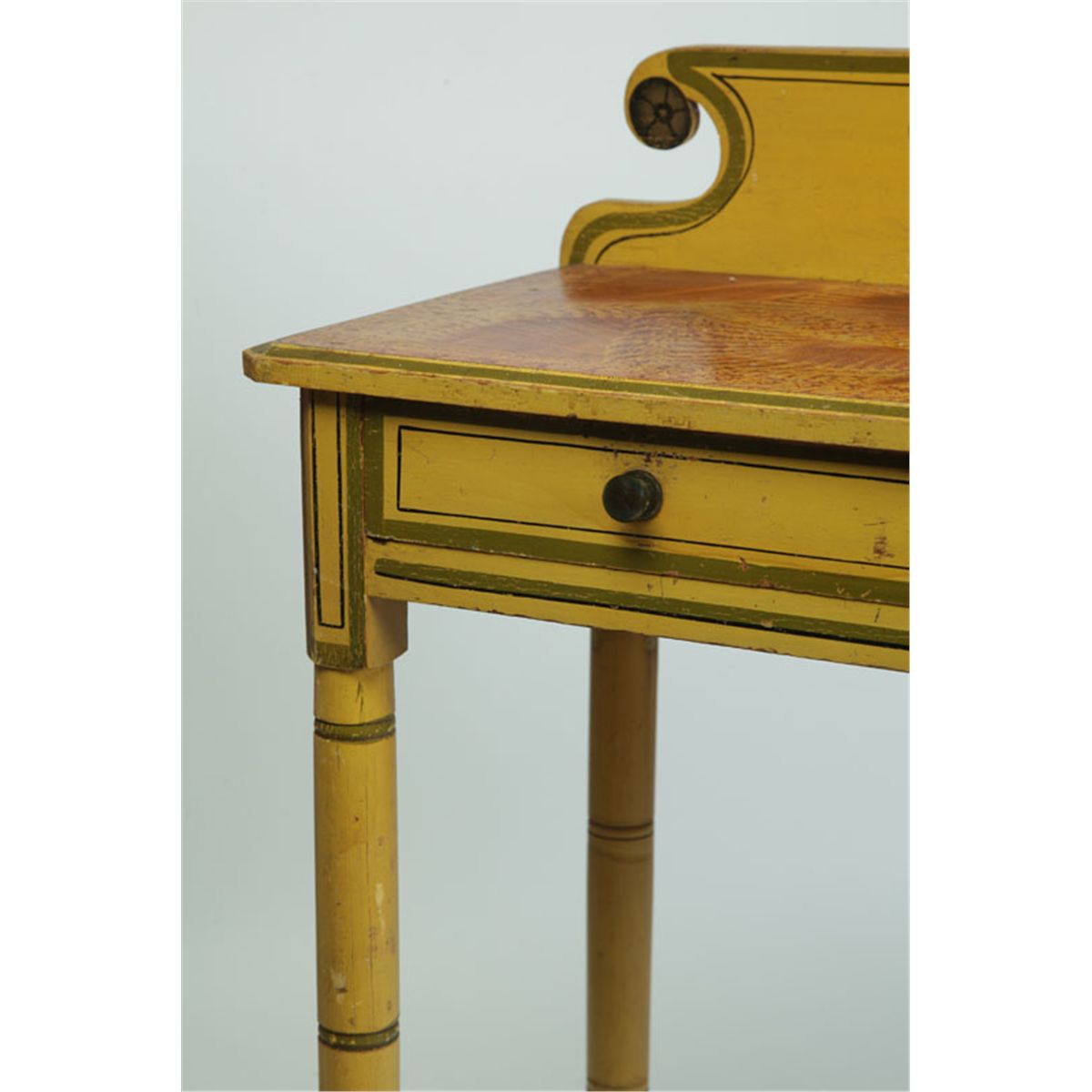 New England, 1820-1850, pine. Scroll-cut backsplash, one drawer, and turned legs. Retaining its original fruit decoration against a yellow ground, and a fancy decorated top surface. Age split to the top, period brass pulls. 34 1/4"h. 32"w. 15 1/2"d. Ex Tom Delach (Ohio).