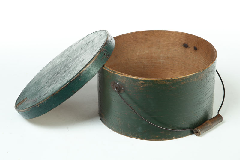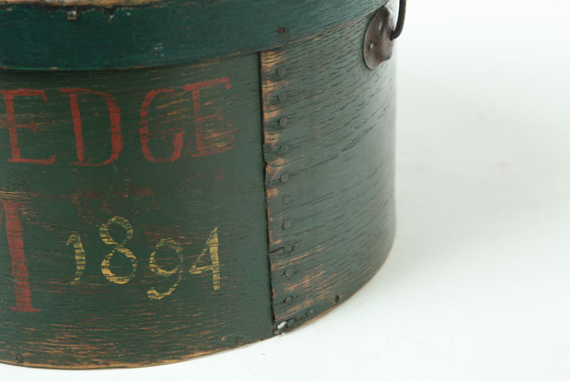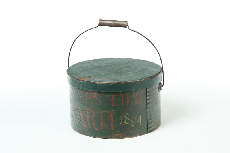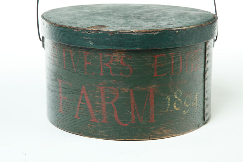 Found in Wisconsin, late 19th century. Round bentwood carrier with lapped seams and original paint "River Edge Farm 1894" on green. Inspection stamps on bottom. Lid has some damage. 6 1/2"h. 11"d.