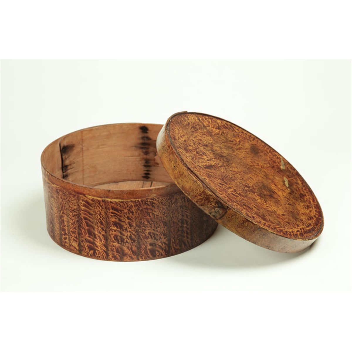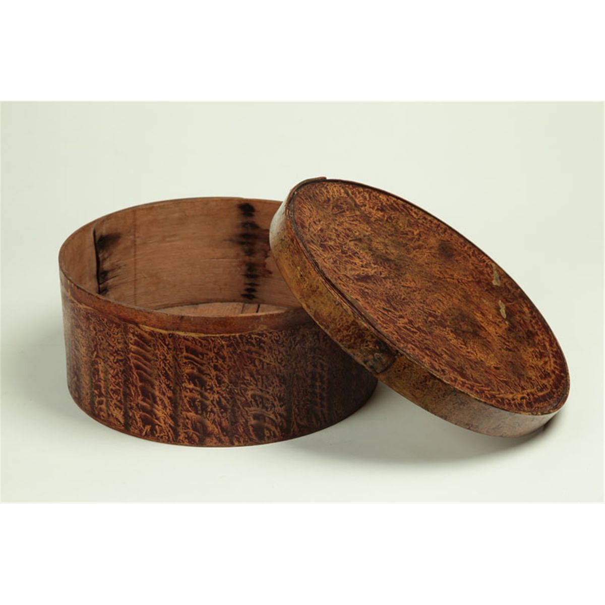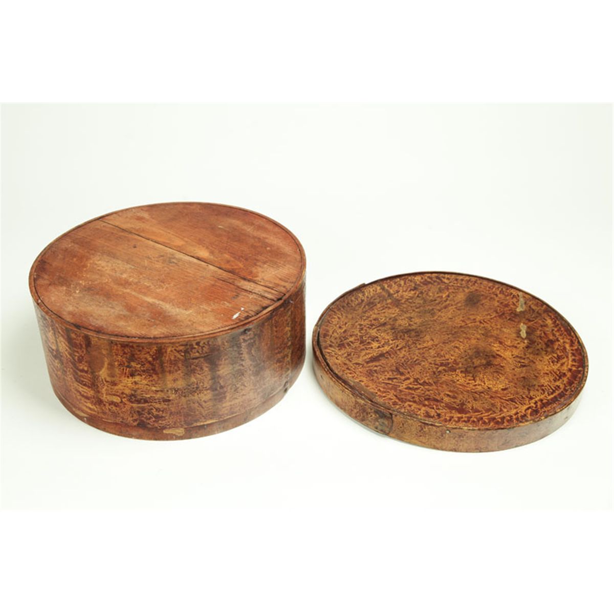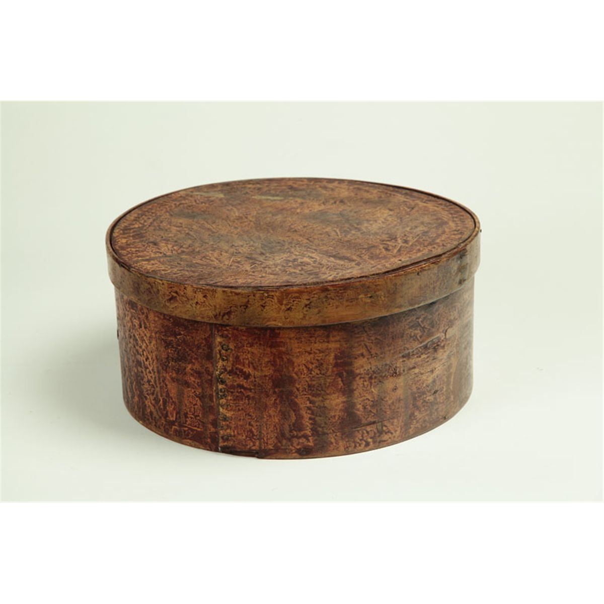 American, 1820-1850, mixed woods. Large box retaining its original brown and yellow vinegar decoration. Minor paint loss to the top, some warping to the top, age split to the bottom. 12 1/2"d.