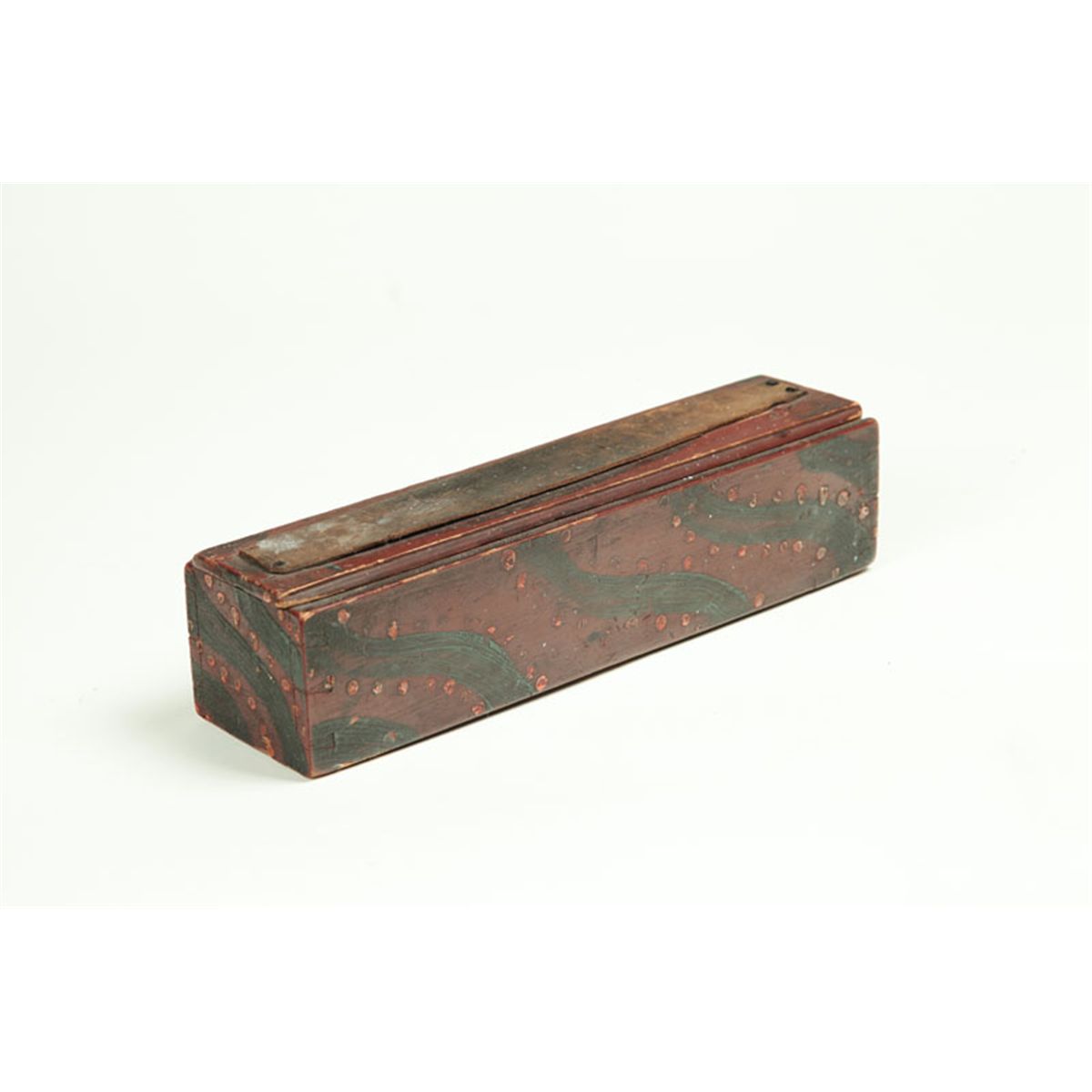 American, 19th century, pine. Dovetailed box with a leather strop mounted on the sliding lid. Retains its original red and blue paint decoration. Wear from use. 2 1/2"h. 11 1/2"l. Ex David Good (Ohio).
