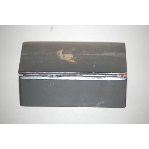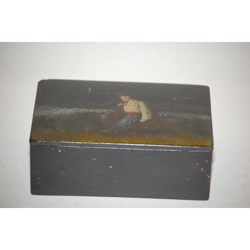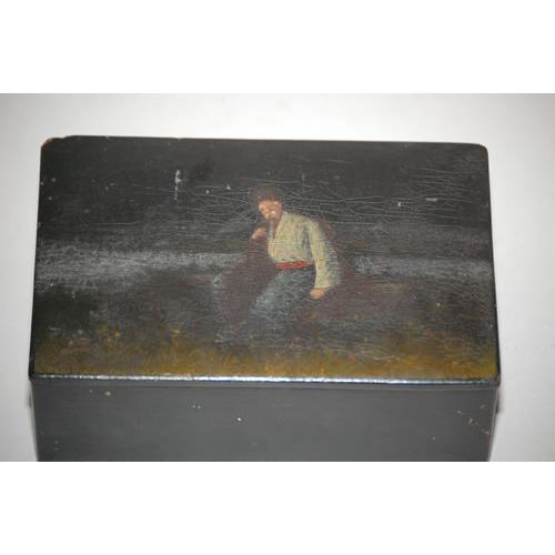 DECORATED RUSSIAN LACQUERED BOX - LATE 19TH-EARLY 20TH CENT. BLACK LACQUER TRINKET BOX W/ PORTRAIT OF A GENTLEMAN IN TRADITIONAL RUSSIAN PEASANT COSTUME RESTING & RED LACQUER INTERIOR (2 3/16" T X 6" W X 3 3/4" D) - WEAR, CHIPS & CRAZING