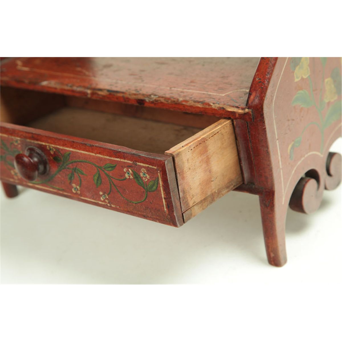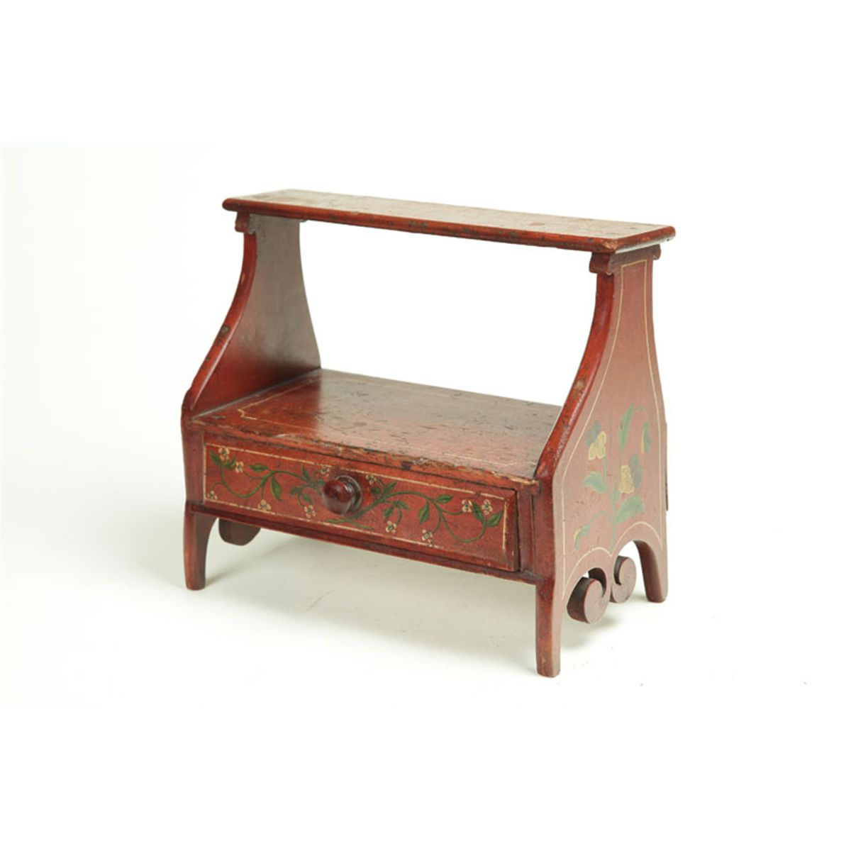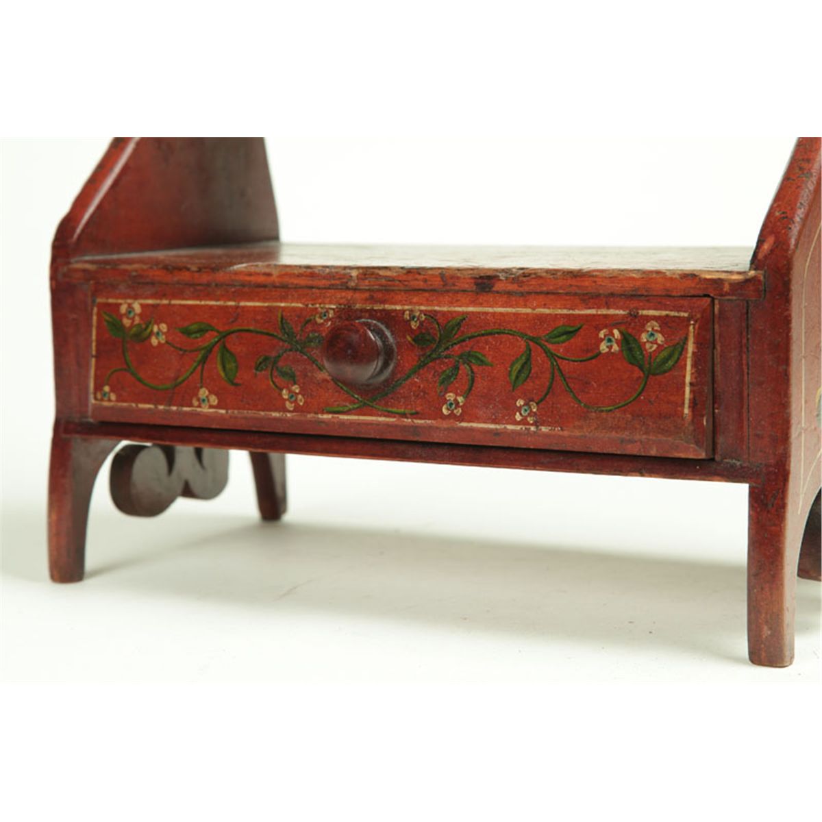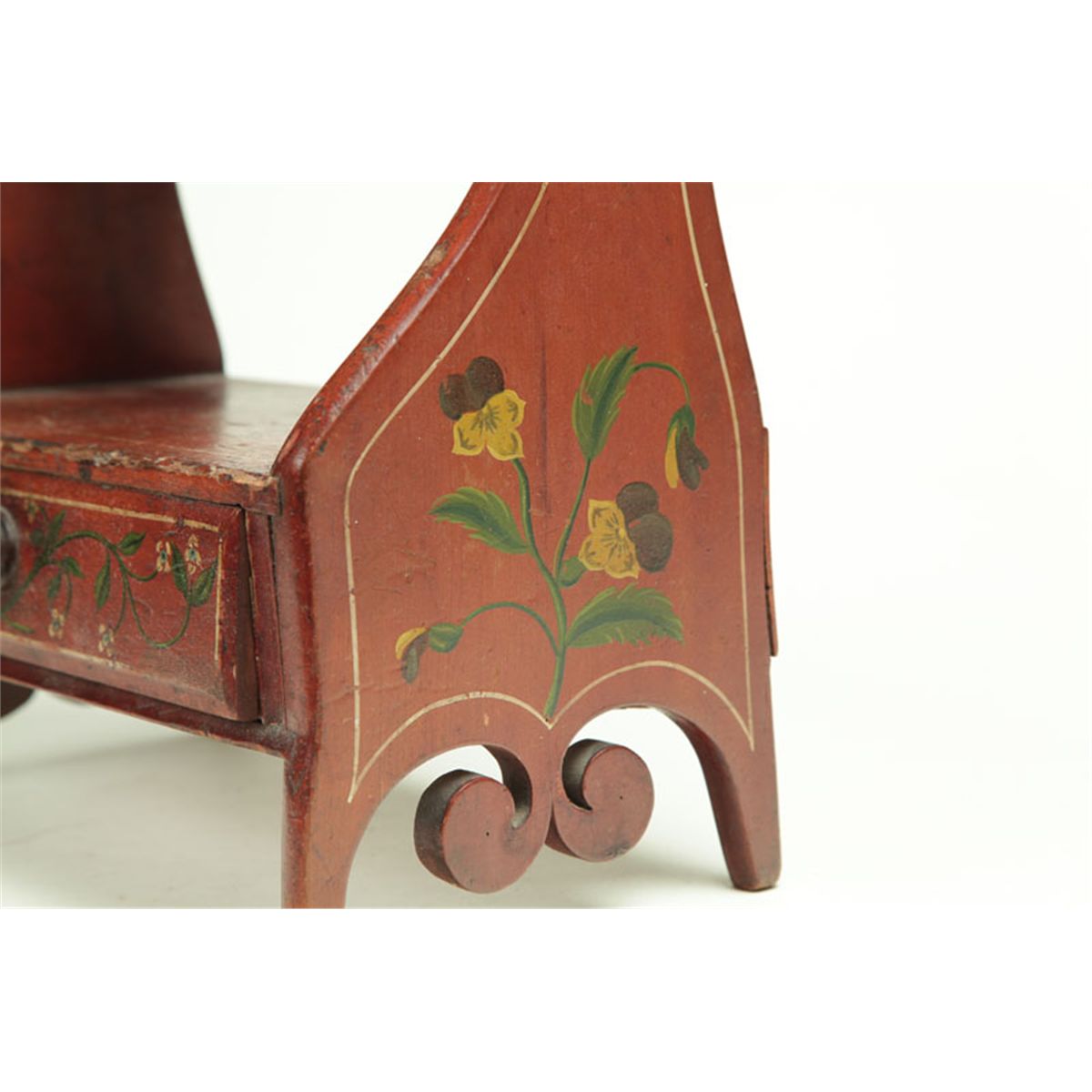 Pennsylvania or Ohio, mid 19th century, walnut, cherry, and poplar. An unusual form with an upper shelf, a lower drawer, high feet, and scroll-cut drops on the sides. Retains its original paint decoration consisting of a red ground with yellow/cream stringing and polychrome flowers. 11"h. 12"w. 6"d. Ex David Good (Ohio), sold at Garth's, May 2007, lot 116.