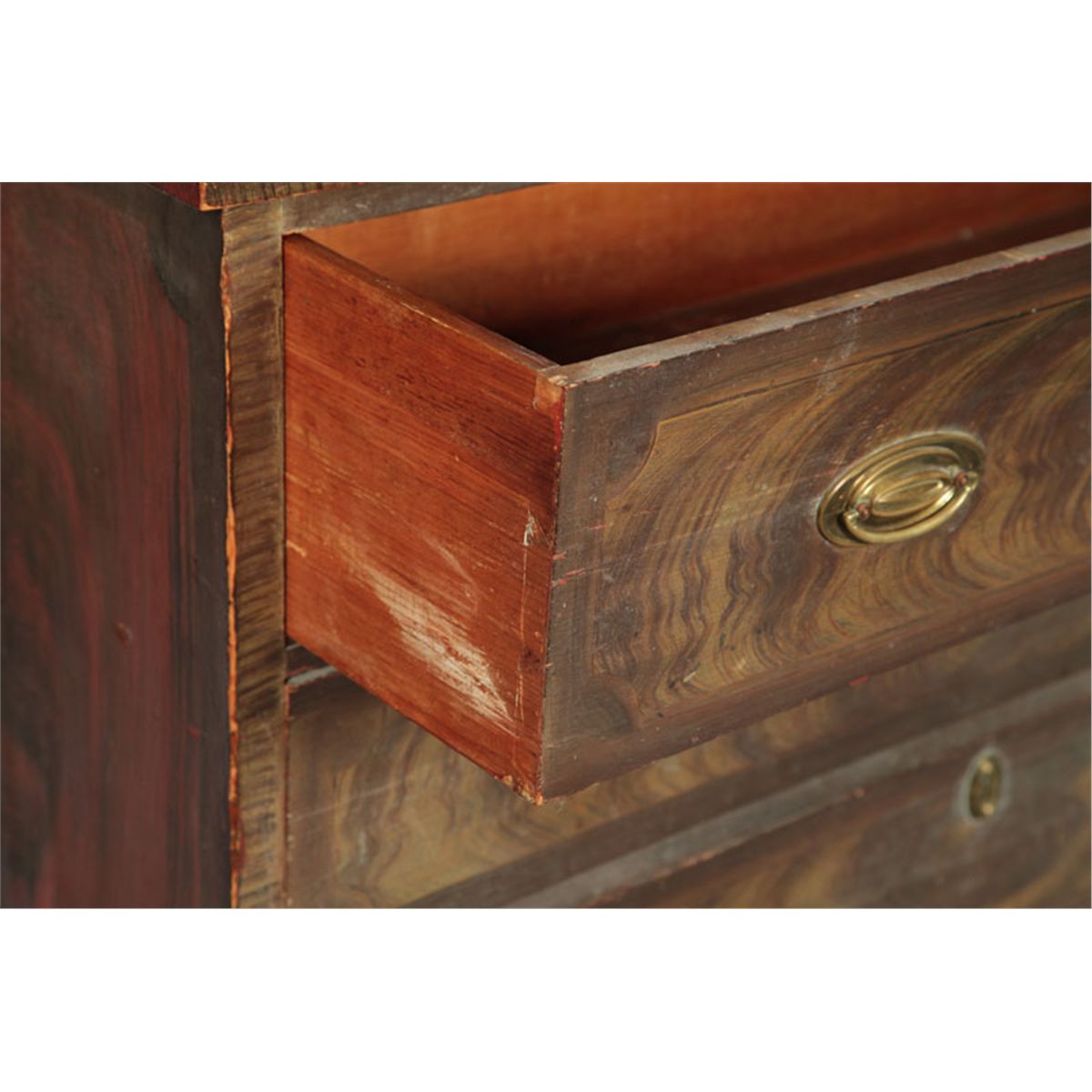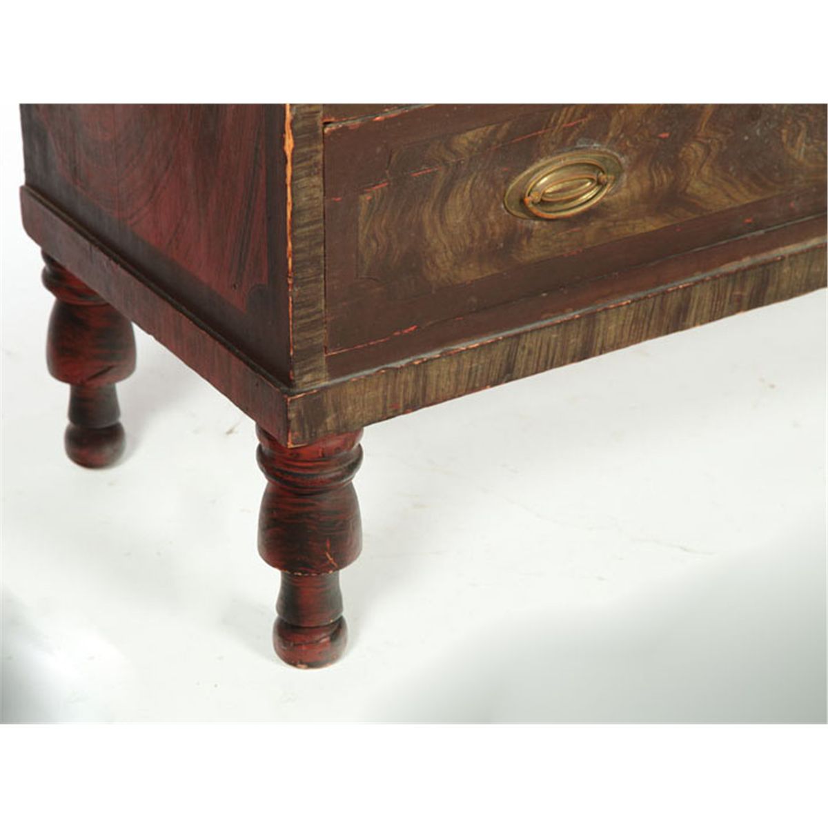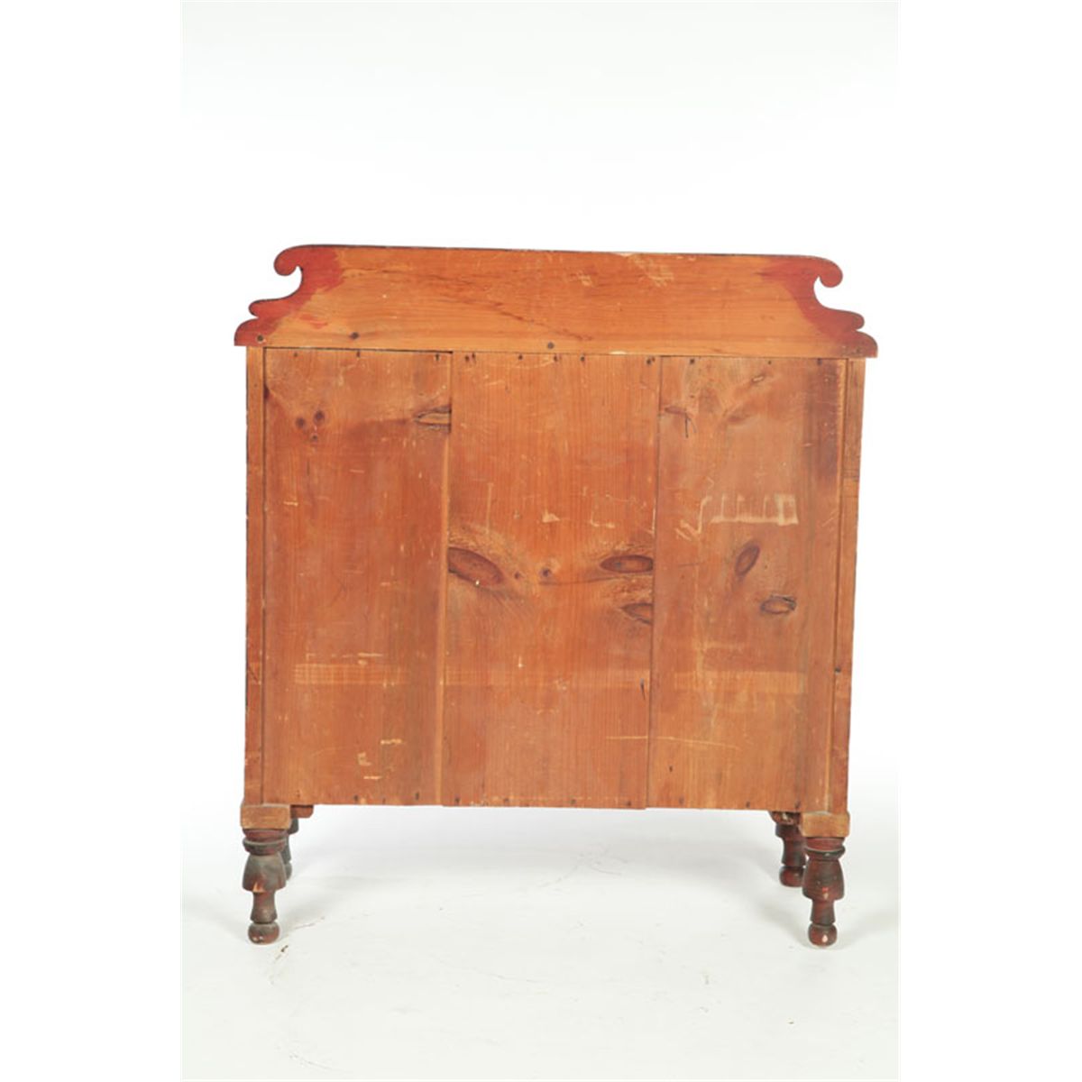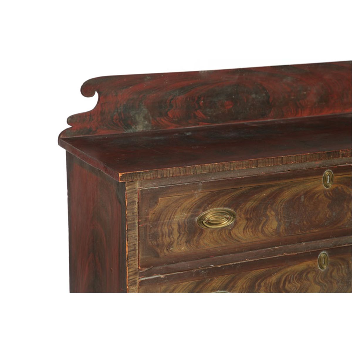 American, 1820-1850, pine. Shaped backsplash, four drawers, turned feet. Backsplash, sides, and feet are faux rosewood. Front is brown over yellow, each drawer mimicking bookmatched veneer. Replaced pulls in original holes. 47"h. 42"w. 16 1/2"d. Ex Gary Ludlow (Ohio).