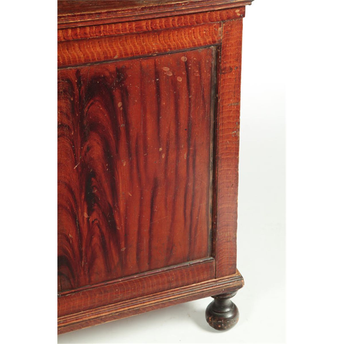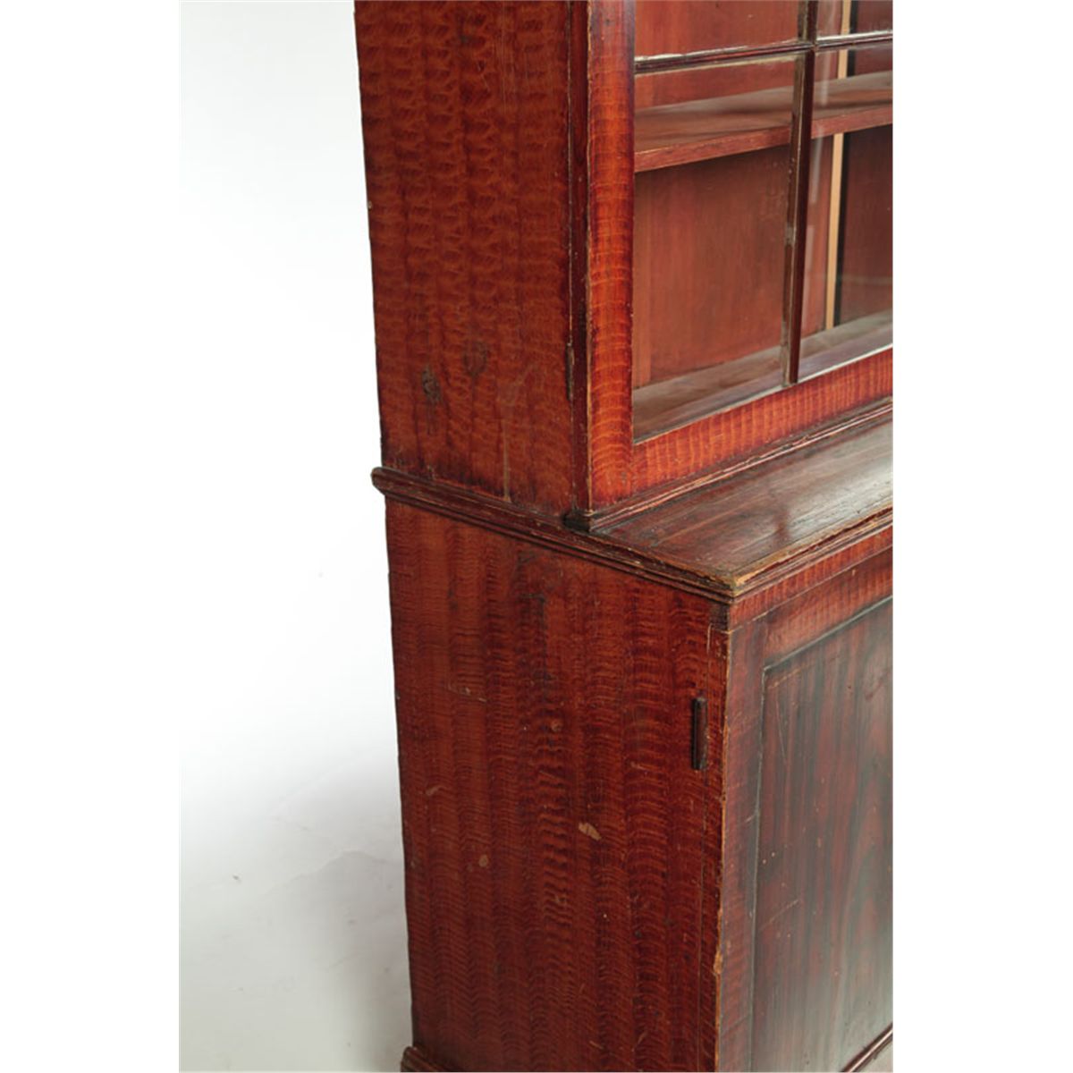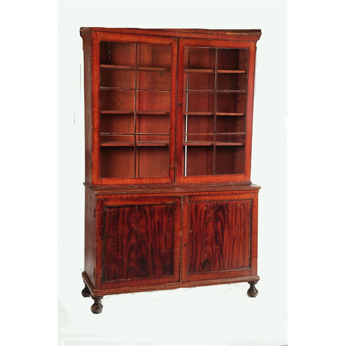 Attributed to the Shenandoah Valley of Virginia, 1820-1840, white and yellow pine. One-piece, the upper section with two six-pane doors and adjustable shelves; the lower section with two paneled doors; all resting on turned feet. Retains its original grain-painted decoration. Glass is all original, one pane is cracked, retains key for the upper section, minor wear and paint loss. 85"h. 55"w. 18 1/2"d. Ex Don Walters (Massachusetts), ex Deanne Levison (Georgia).