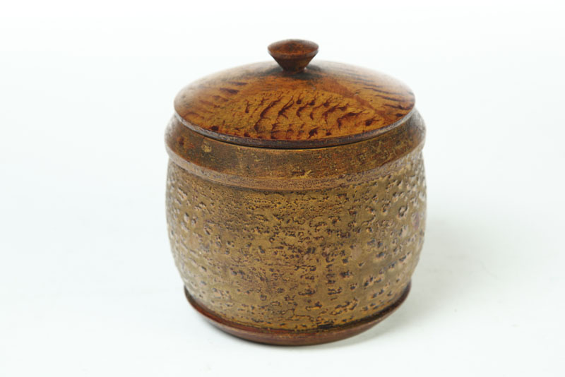 American, mid 19th century. Vinegar decorated in brown and mustard. Lid has good decoration, base is alligatored. 6 1/4"h.