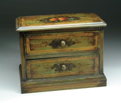 DECORATED TWO DRAWER TABLE TOP CHEST. The molded edge top has paint decoration of fruit and leaves on a green and mustard lined background. Drawers have small turned wood finials and are dovetailed. Sides with similar decoration as the top and the front has similar background to top and sides. SIZE: 11in. h x 14-1/4in. w x 8-1/4in. d. CONDITION: Generally very good. 9-26139