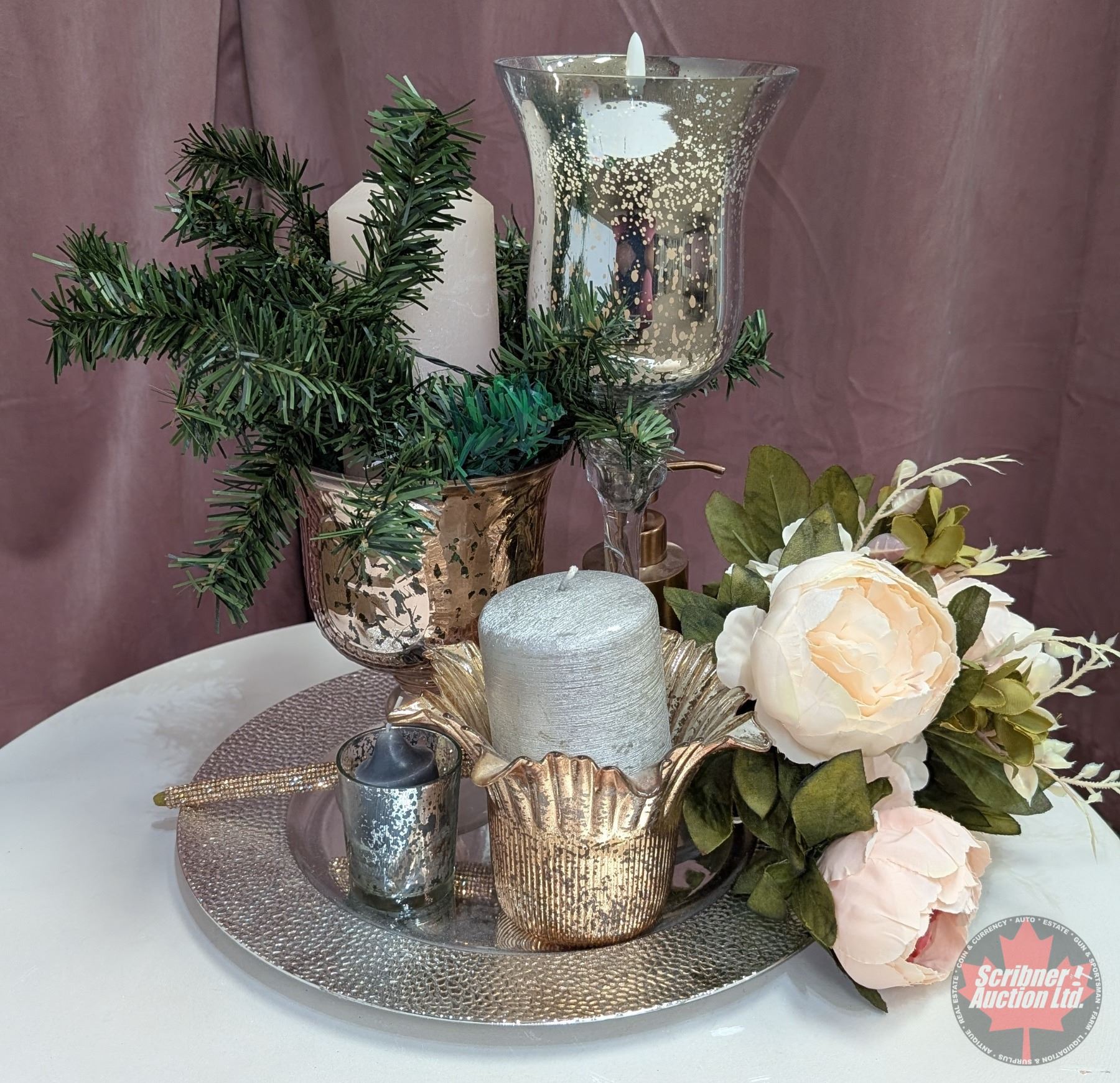 DECORATIONS : Silver Tray w/Silk Flowers, Hand Sanitizer Container, Candle, Vase, etc