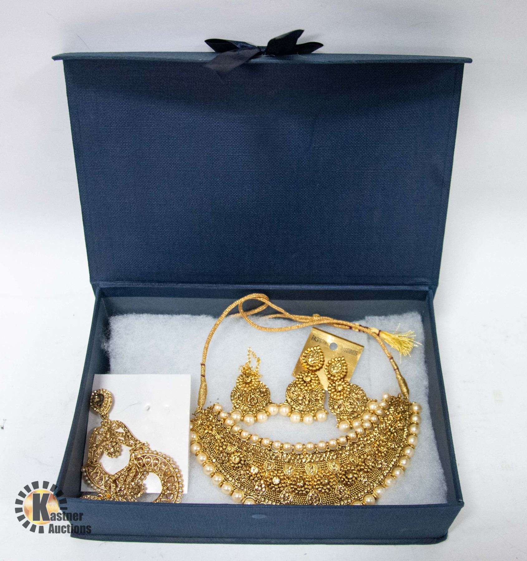 GLITTERING CRYSTAL NECKLACE AND EARRING SET (GOLD-TONE) - ADJUSTABLE NECKLACE, 2 SETS OF EARRINGS AND A MATCHING CLIP PIECE **ALL ITEMS MUST BE REMOVED BY 5PM SATURDAY, FEBRUARY 10TH 2024. ALL REMAINING ITEMS WILL BE SUBJECT TO A $6.00 PER DAY STORAGE CHARGE. ANY ITEMS REMAINING AFTER MONDAY, FEBRUARY 26TH, 2023 WILL BE CONSIDERED FORFEITED. NO REFUNDS WILL BE ISSUED FOR FORFEITED ITEMS. TO SCHEDULE A PICK UP APPOINTMENT CLICK HERE