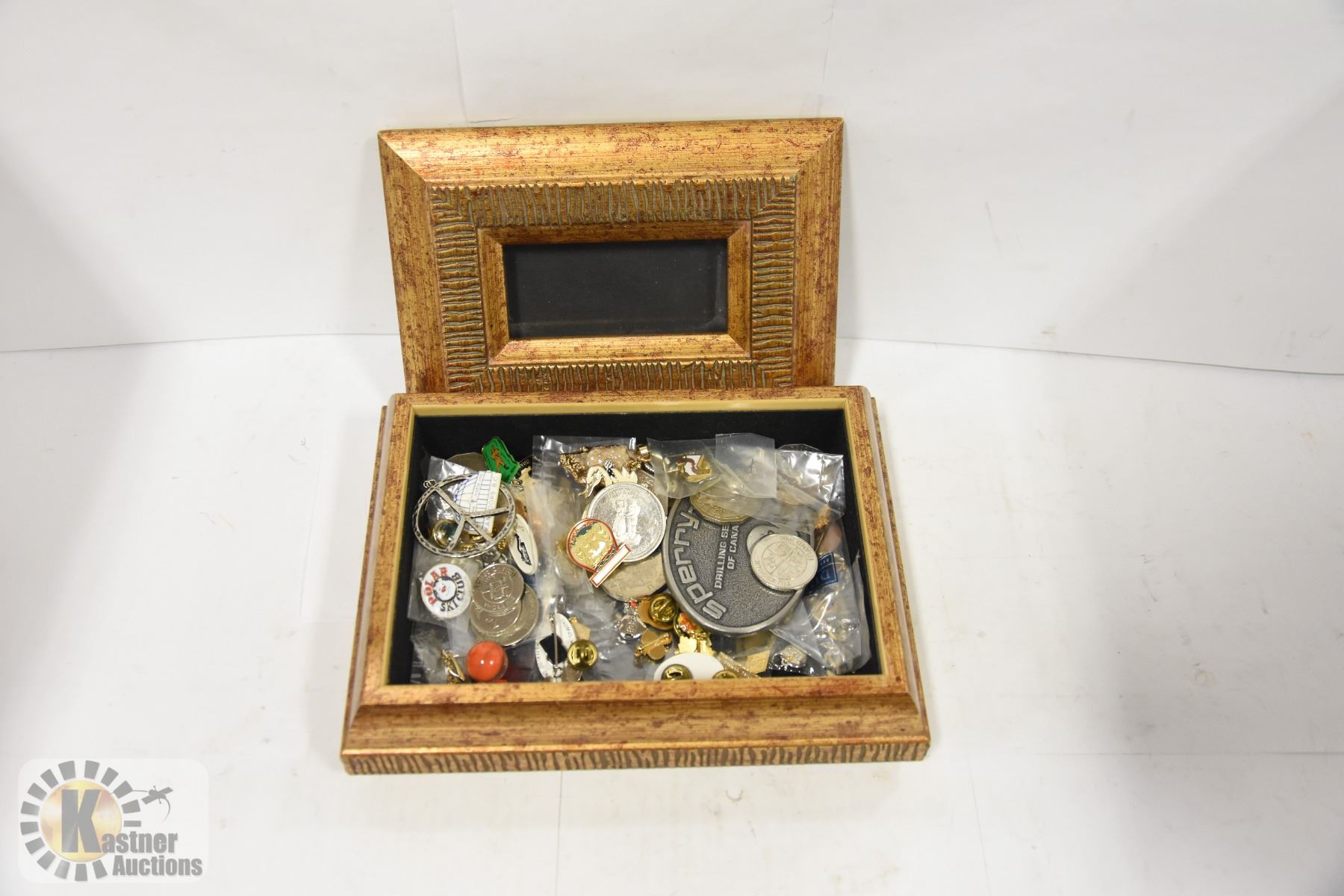 LOTS OF NEW PINS, CHARMS, PENDANTS INCLUDING SOME WITH GEMSTONES & VINTAGE, BELT BUCKLE, COLLECTIBLE WORLD COINS, ETC.