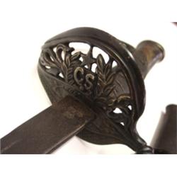 Decorative Confederate Civil War sword with sheath. Blade is stamped Boyle & Gamble and CS 1862 on reverse side. Sword measures 38.5" L.