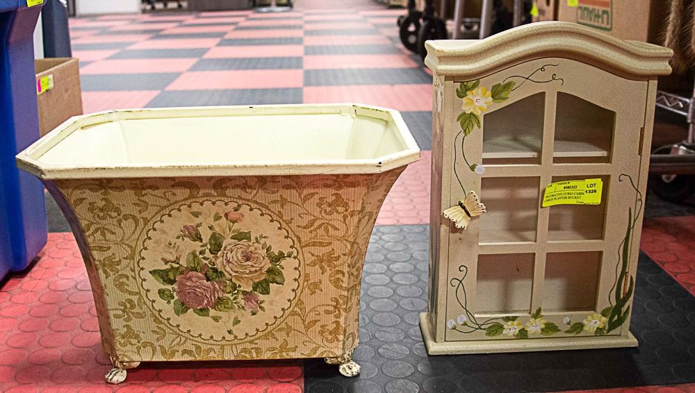 DECORATIVE CURIO CABINET & PLANTER BUCKET