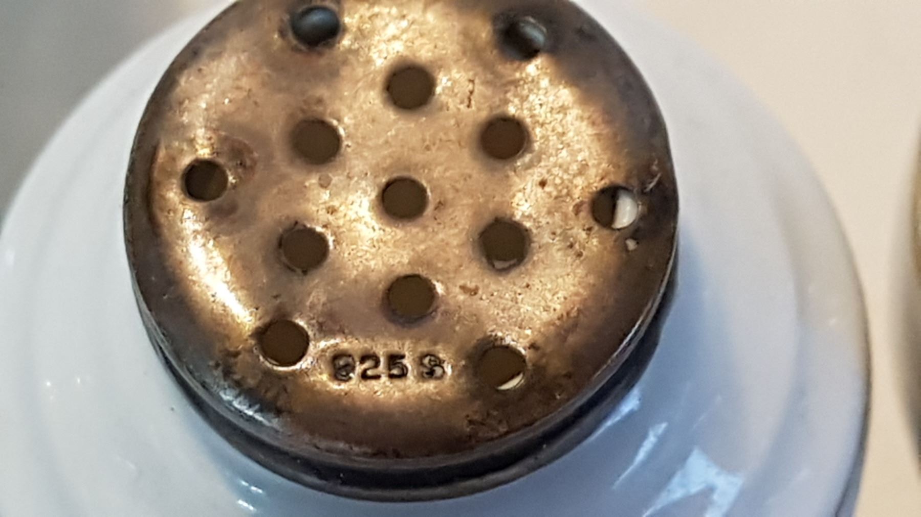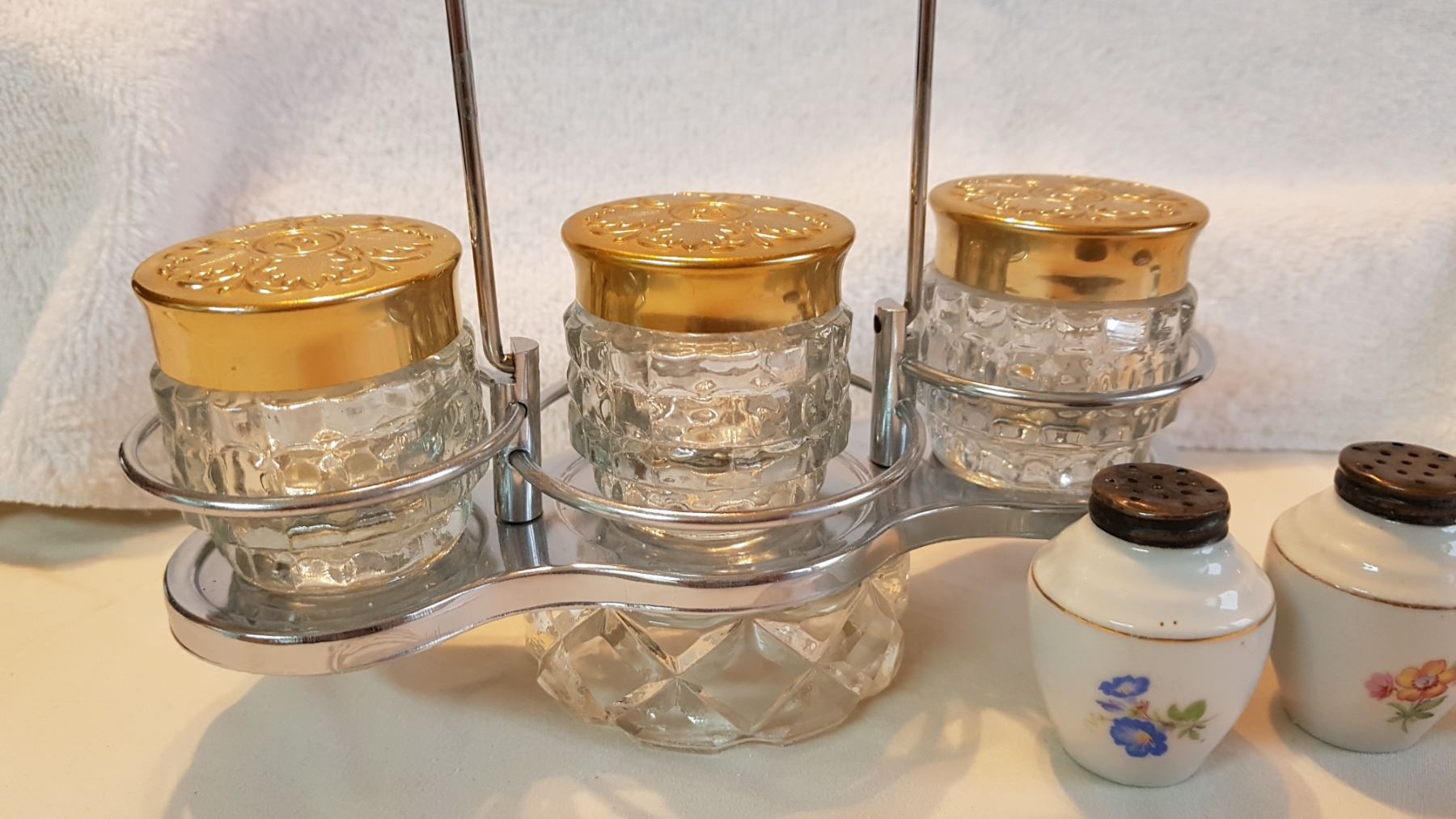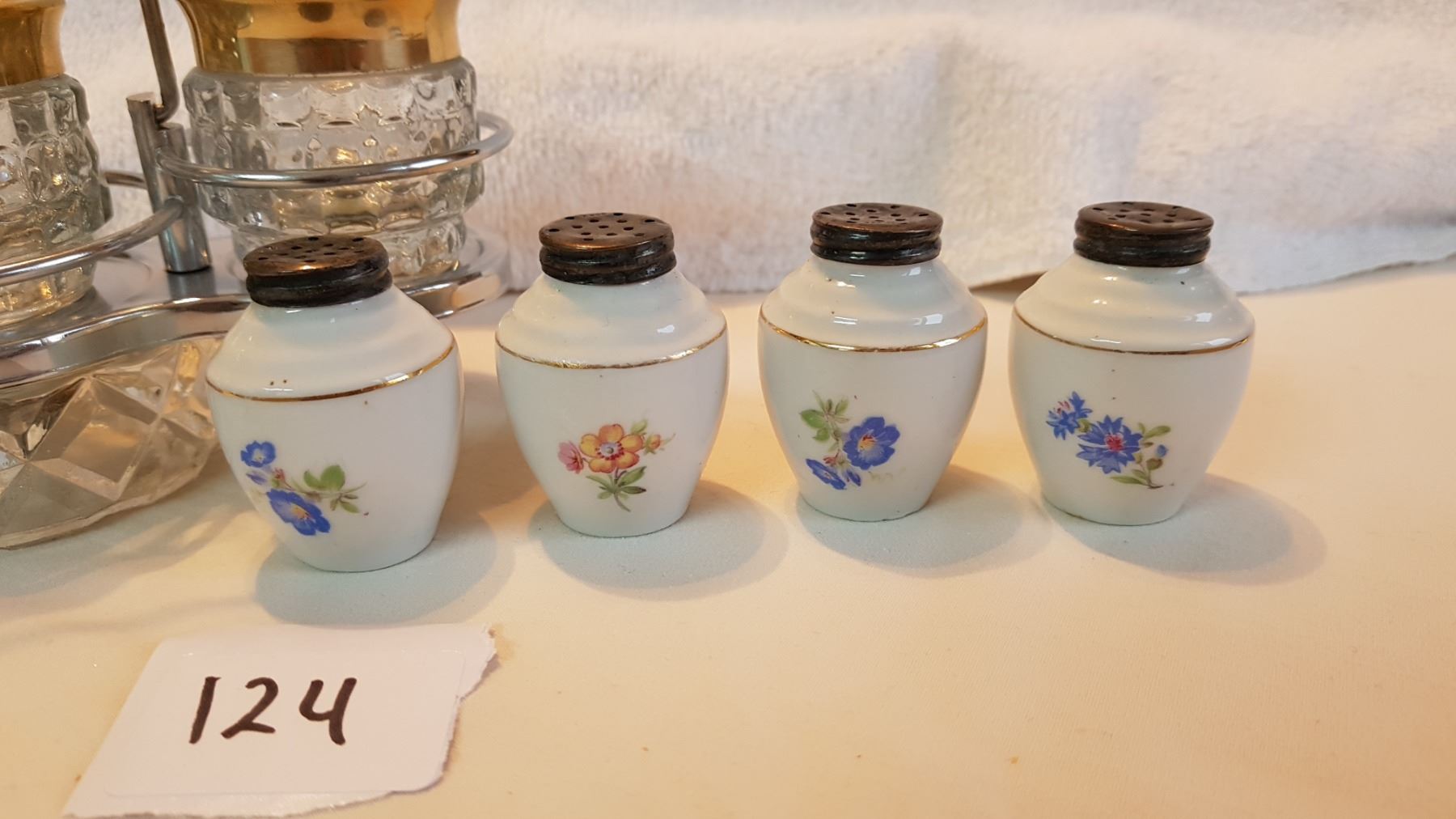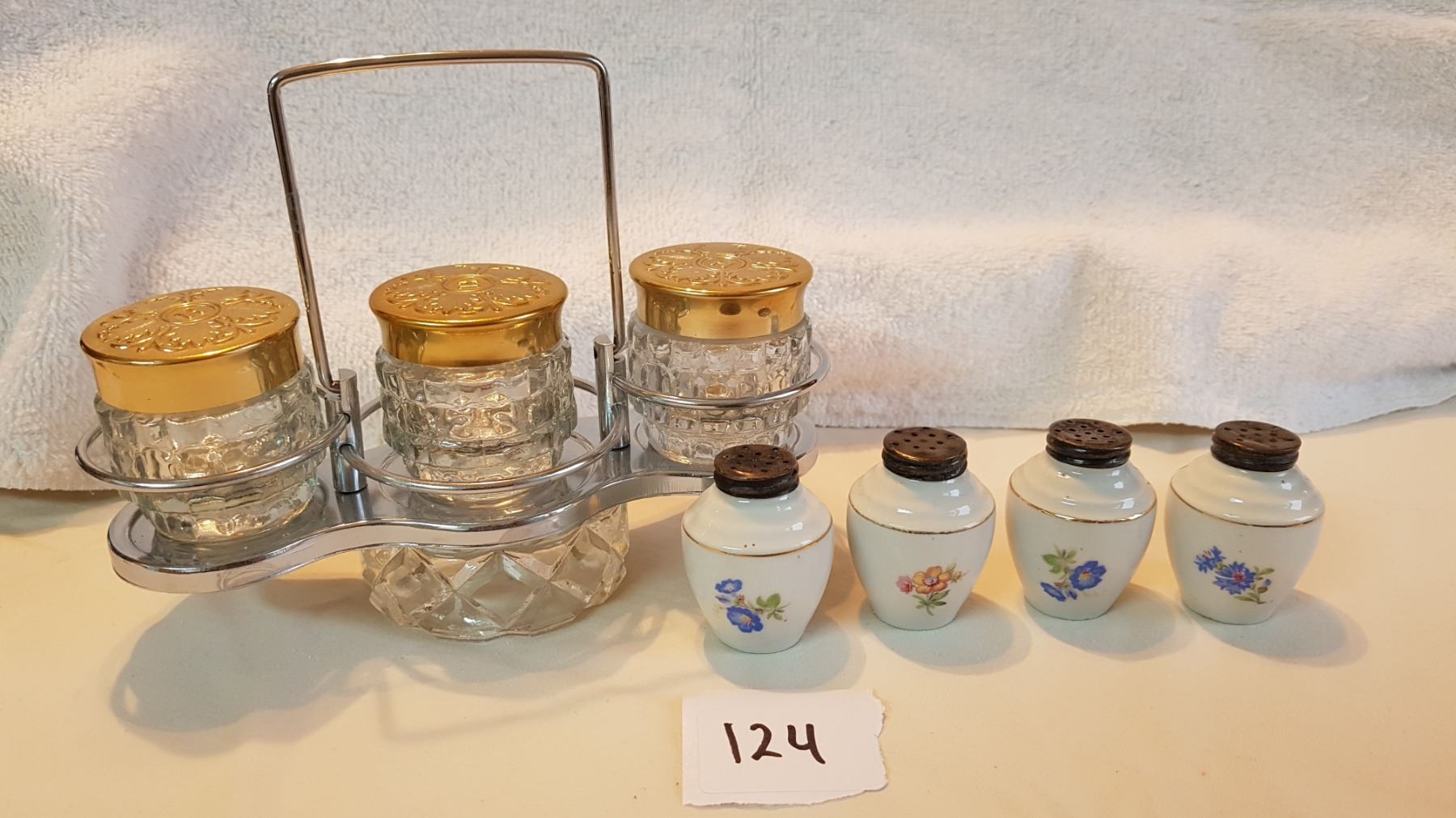 DECORATIVE DRESSER SET & 4 SPICE SHAKERS W/ STERLING SILVER TOPS