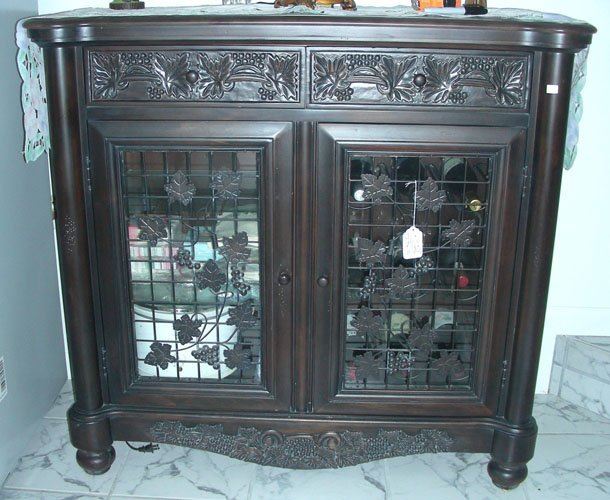 Ornate carving. Two doors with metal work and glass panes open to reveal storage and a wine rack. 42" high, 45" wide, 19 1/2" deep.