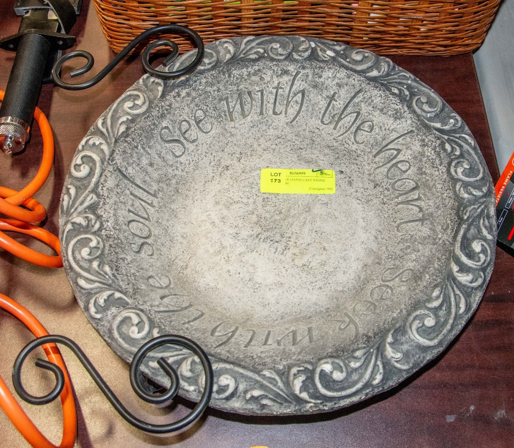 BOWL - READS "SEEK WITH THE SOUL, SEE WITH THE HEART" ON FANCY METAL STAND, MADE IN BC (PLATE DIAM. IS 14", OVERALL HEIGHT ON STAND-16"H)