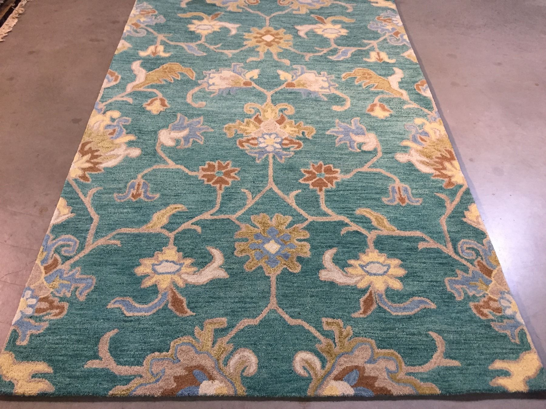 5'.2"'X8' hand-made wool pile rug in modern design , teal and multi accent colors . Hand Tufted in India.