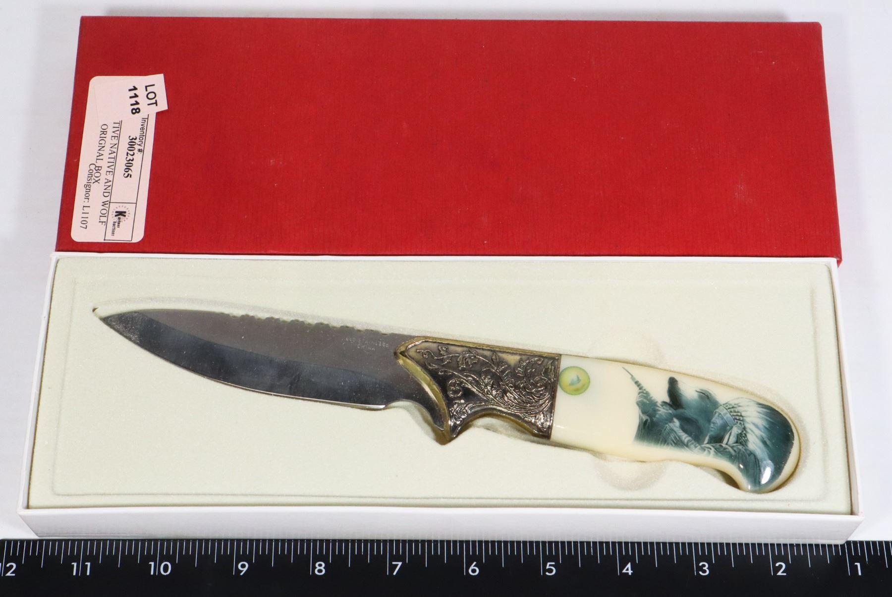 DECORATIVE NATIVE AND WOLF KNIFE IN ORIGINAL BOX