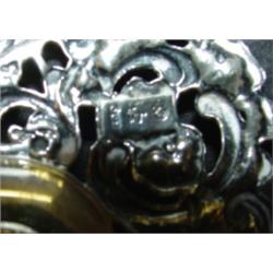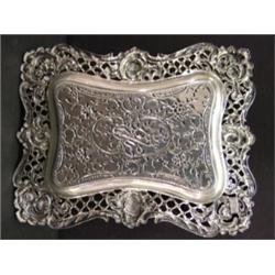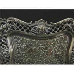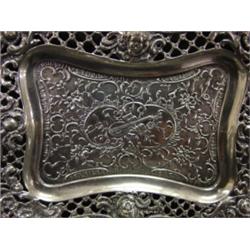 DECORATIVE STERLING SILVER TIP TRAY. Has reticulated sides, decorated with cherub on top and bottom. Mandolin decoration in center. Hallmarked on reverse. 4.25" x 3.5"