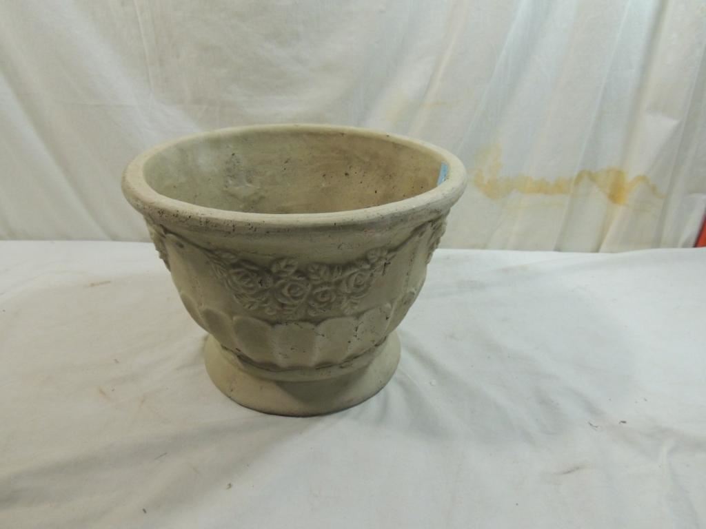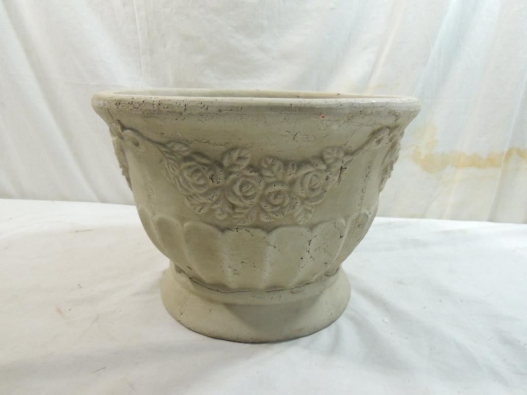 DECORATIVE PLANTER, STONELIKE FINISH, FLOAL DETAILS, DECORATIVE INDOOR/OUTDOOR, PLANTER AS SHOWN SEE PHOTO FOR MORE DETAILS.