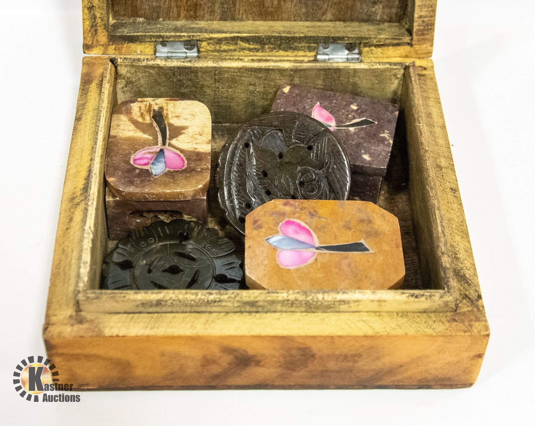 CARVED DARK MEDALLIONS AND 3 STONE TRINKET BOXES WITH LIDS **ALL ITEMS MUST BE REMOVED BY 5PM SATURDAY, DECEMBER 7TH 2024. ALL REMAINING ITEMS WILL BE SUBJECT TO A $6.00 PER DAY STORAGE CHARGE. ANY ITEMS REMAINING AFTER MONDAY, DECEMBER 23RD 2024 WILL BE CONSIDERED FORFEITED. NO REFUNDS WILL BE ISSUED FOR FORFEITED ITEMS. TO SCHEDULE A PICK UP APPOINTMENT CLICK HERE