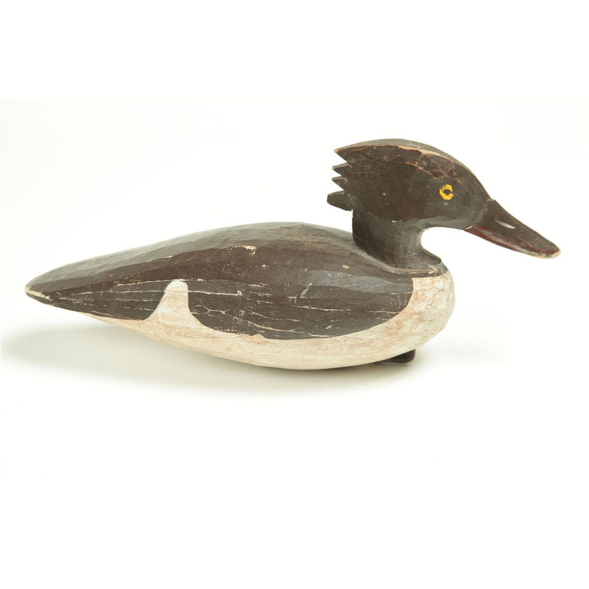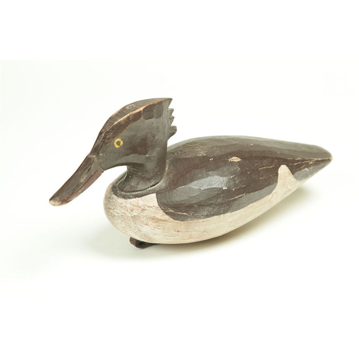 American, early 20th century, softwood. Folksy merganser with old working repaint. 11 1/2"l.