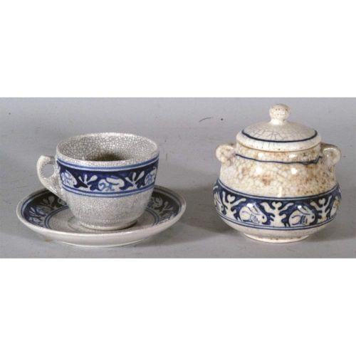 DEDHAM POTTERY (2) with rabbit border 4 1/2" sugar jar and cup and saucer (6" width of saucer) CONDITION REPORT: staining to sugar. PACKING AND SHIPPING: We offer packing (double boxed in most cases) and shipping of this item within the Continental United States by USPS or UPS (our choice- boxes over 30lbs or oversized may be recalculated based on buyer's location), NOT INCLUDING INSURANCE (it will be added when we know the sales price) for $30 We will adjust shipping when lots can be combined.